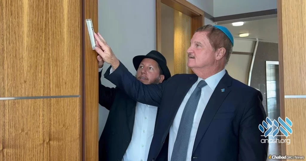 Aruba’s Jewish Prime Minister Mike Eman invited shliach Rabbi Ahron Blasberg to his headquarters, where he donned tefillin, heard the shofar, and placed a mezuzah on his door. This might be the only mezuzah on a premier’s office outside of Israel.