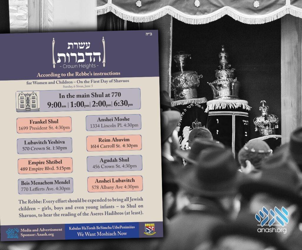 Full list of Asseres Hadibros readings which will be held across Crown Heights to allow all men, women and children to attend, in accordance with the Rebbe’s instruction.