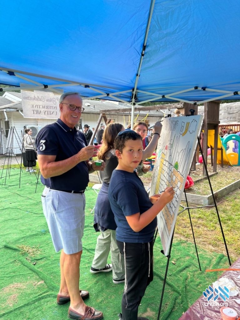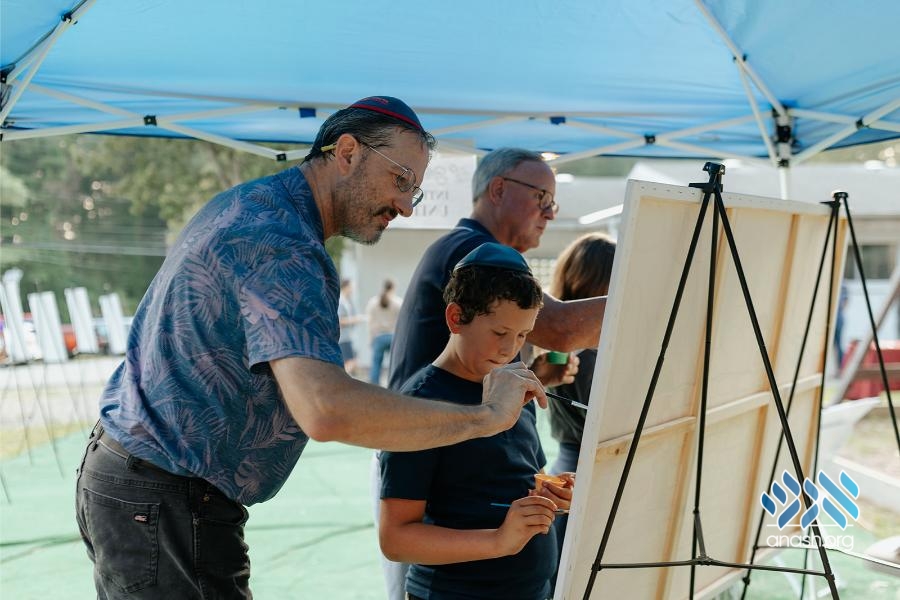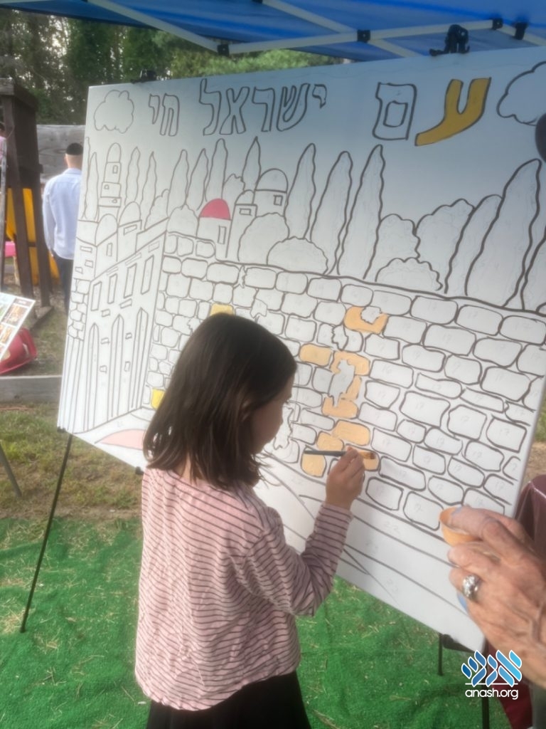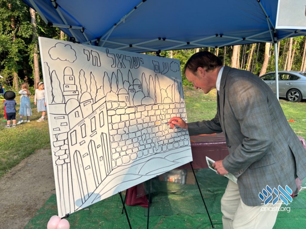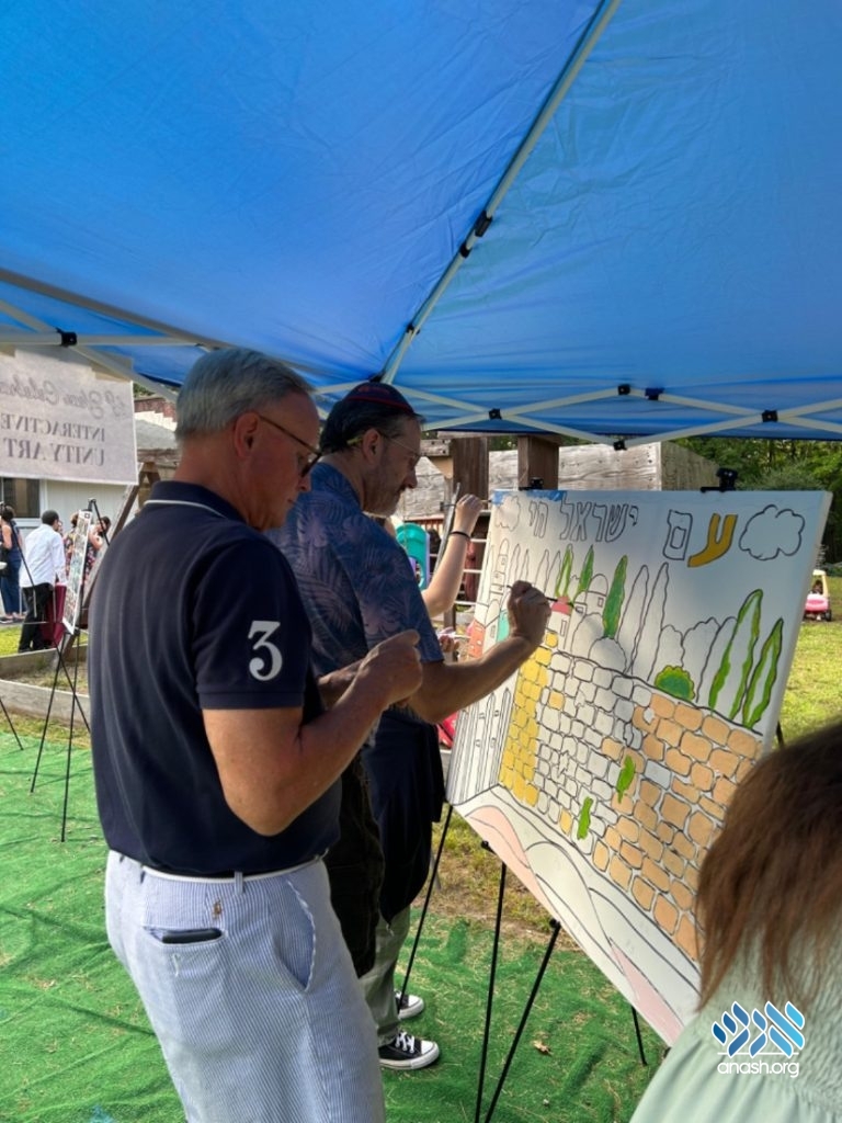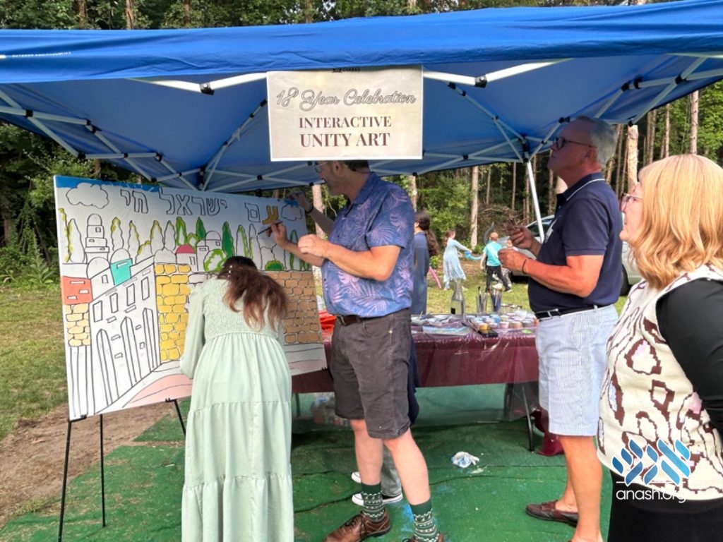 The event opened with a Chai Photo Gallery, showcasing memorable moments from the past 18 years of outreach. Photos were arranged by year on beautiful display boards. At the center of the space stood an interactive unity art project—a “Paint by Number – Am Yisroel Chai” mural of the Western Wall, designed by Rivi Bahir and color-coordinated under the guidance of Alyla Goldman, symbolizing unity, that everyone counts, their effort and unique color they paint and only together we complete our mission.
