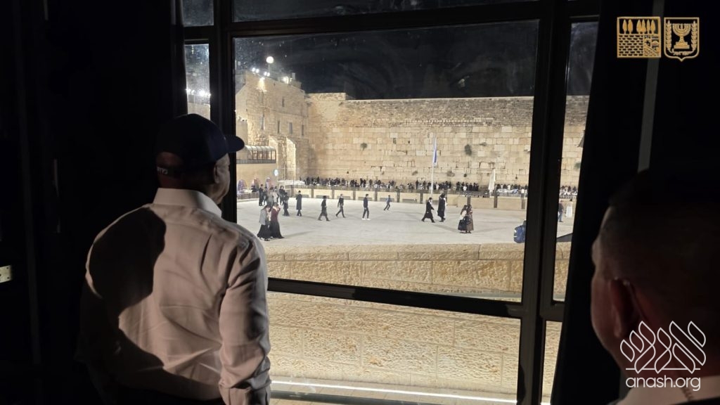 The outgoing mayor was warmly received by the worshipers and visitors who were present at the Wall during his visit. During the visit, the mayor received an explanation about the importance of this holy site for the Jewish people as a source of prayer, hope, and longing throughout the generations. He was thanked for his unwavering support for Eretz Yisroel and for his fight against antisemitism, and for choosing to conclude his term with a solidarity visit to Israel and to the Kosel in Jerusalem.