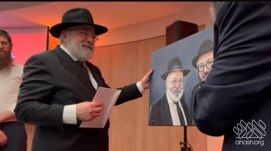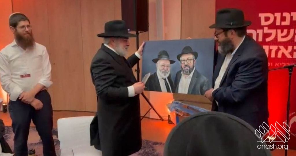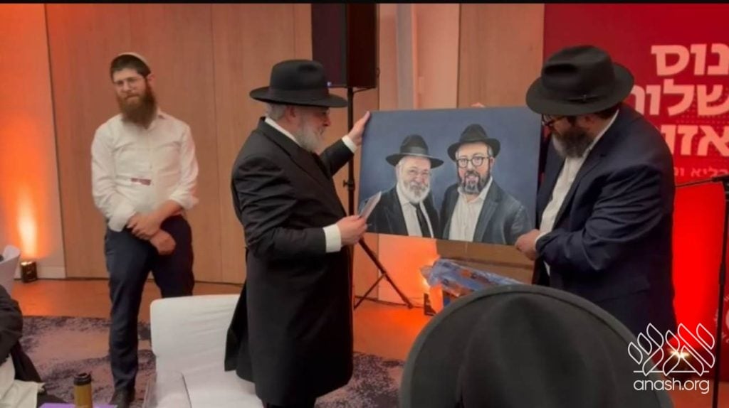 The gift was a painting of Rabbi Ulman together with his beloved son-in-law, Rabbi Eli Schlanger, created by the world-renowned artist Mrs. Miriam Lang. Rabbi Ulman, visibly moved, embraced Rabbi Sufrin and expressed his heartfelt gratitude to the Shluchim for their support and courage during these turbulent times.