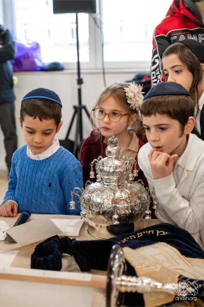 The crowd expressed their gratitude to the donor, R’ Emanuel Mairov, a dignitary of the Vienna community, and to the Sofer, Rabbi Reuven Greenberg, a parent of one of the students.