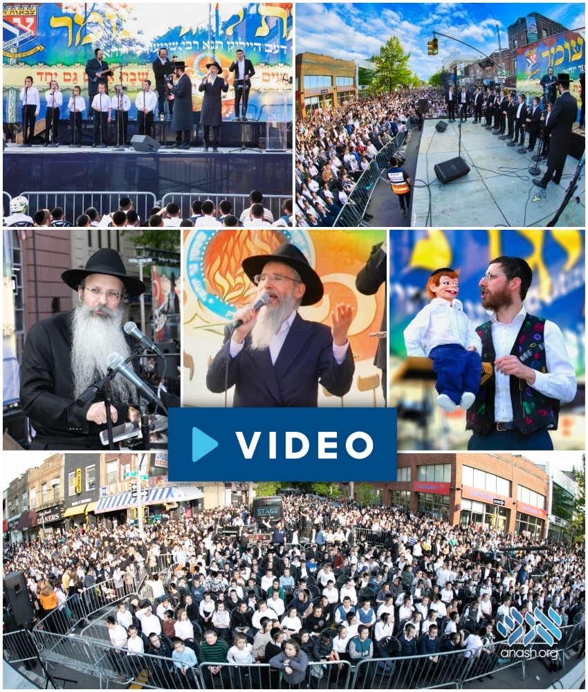 Thousands of children gathered on 13th Ave. in Boro Park for a parade, kinus and Lag B’omer celebration featuring Avraham Fried, Yiddish Nachas, and special entertainment.