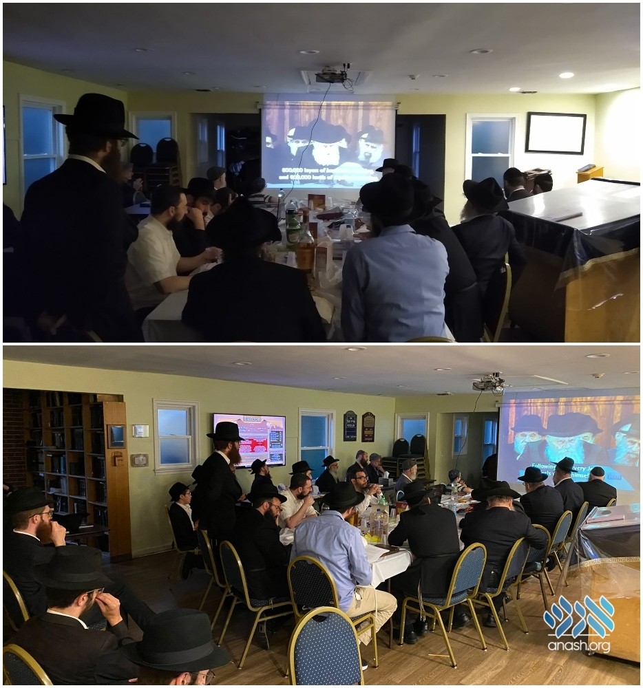 A nice sized crowd gathered at Beis Lubavitch for the viewing, which began after mincha on Sunday night, the eve of Yud Beis Tammuz, and continued until the end of the farbrengen, with a break for ma’ariv. Farbeisen was also provided, all organized by Rabbi Avrohom Kroll.