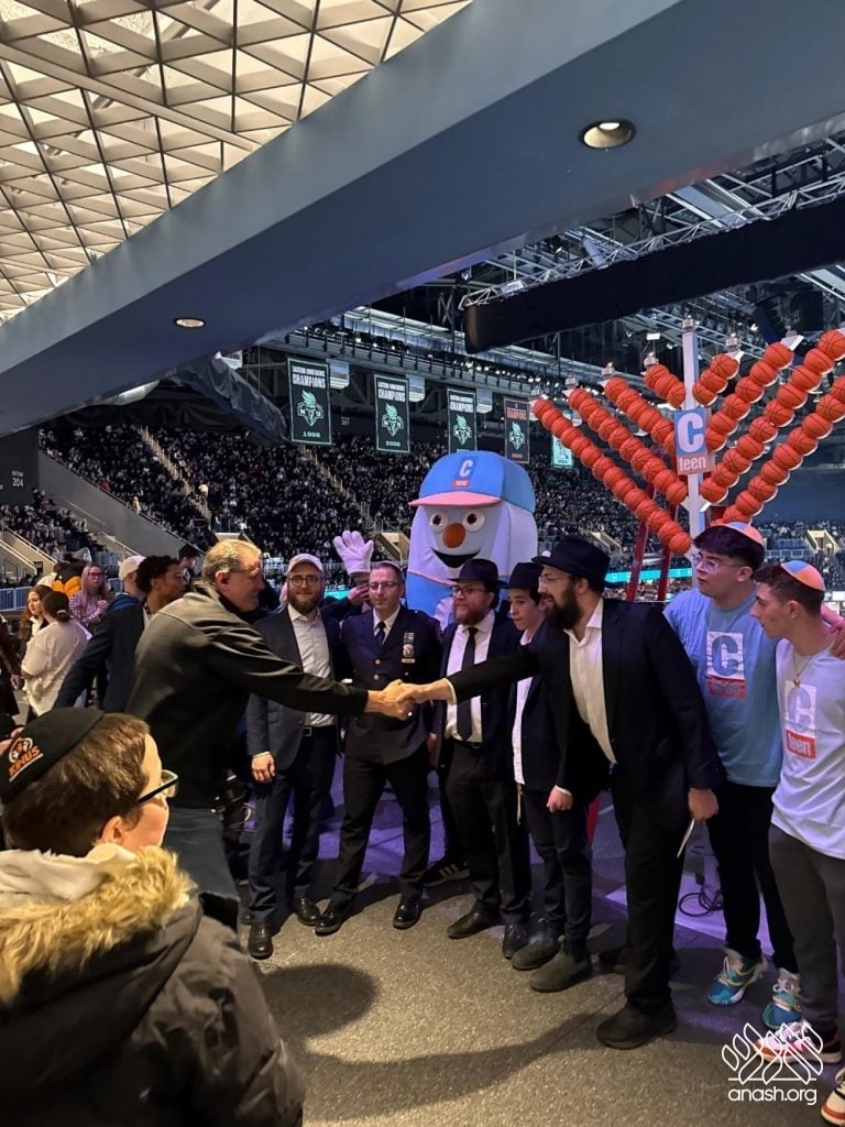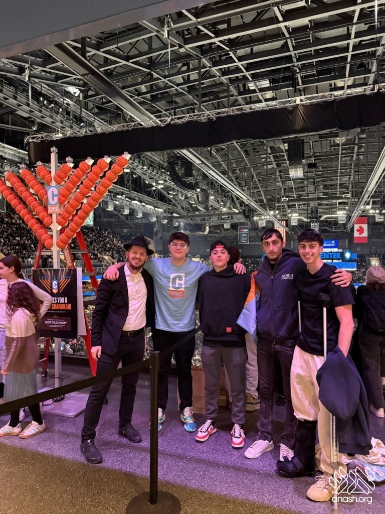 Young Eli was accompanied by Rabbi Mendy Hecht of Chabad Prospect Heights and Rabbi Shimon Rivkin, Director of CTeen International, who co-organized the evening together with the Nets. After reciting the blessings and kindling the Menorah, attendees broke into spontaneous dance, transforming the solemn ceremony into a celebration of Jewish resilience that drew a standing ovation from the arena.