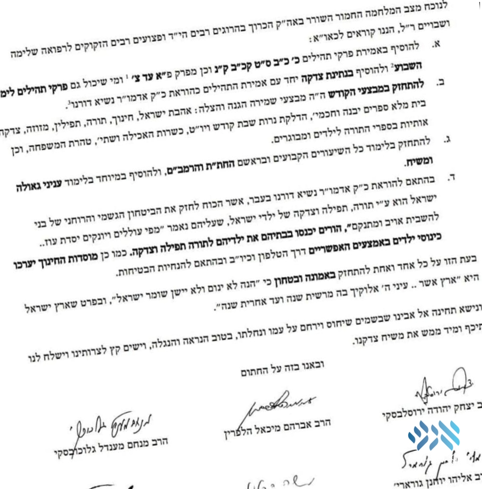 4) In accordance with the Rebbe’s instructions in the past that the power to strengthen the physical and spiritual security of Yidden is through the increase of Torah, Tefillah and Tzedaka of Yiddishe children, of whom the posuk says “Out of the mouth of babes and sucklings You have established strength…in order to put an end to enemy and avenger,” parents should gather their children at home for Torah, Tefillah and Tzedaka, and schools should organize gatherings as possible, through the phone of the like, according to the security regulations.