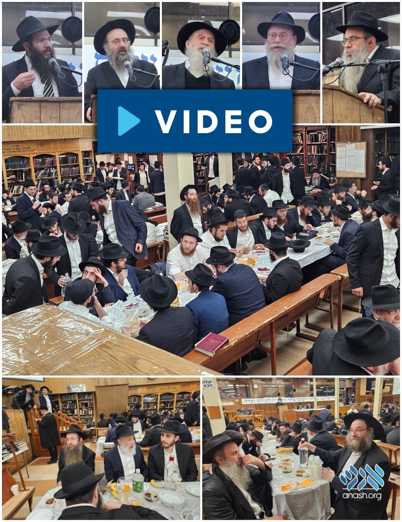 Anash and bochurim gathered in 770 for a farbrengen in honor of the Rebbe Maharash’s birthday, featuring speakers Harav Yosef Braun, Rabbi Michoel Seligson, Rabbi Mendel Yusewitz, Rabbi Dovid Kahanov, and Rabbi Yehuda Butman.