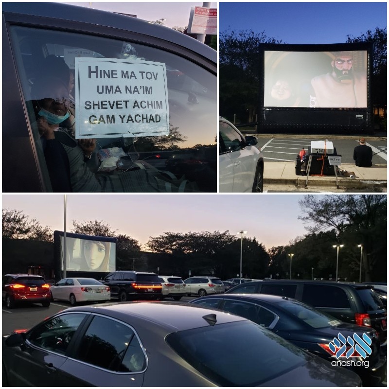 The event was held with full coordination and sign-off by the local county Health Dept and included the screening of two Jewish films, one for kids and one for an older audience. The evening began with a Torah thought, a chapter of Tehillim and 12 pesukim, and the depositing of coins given to each vehicle for Tzedaka.