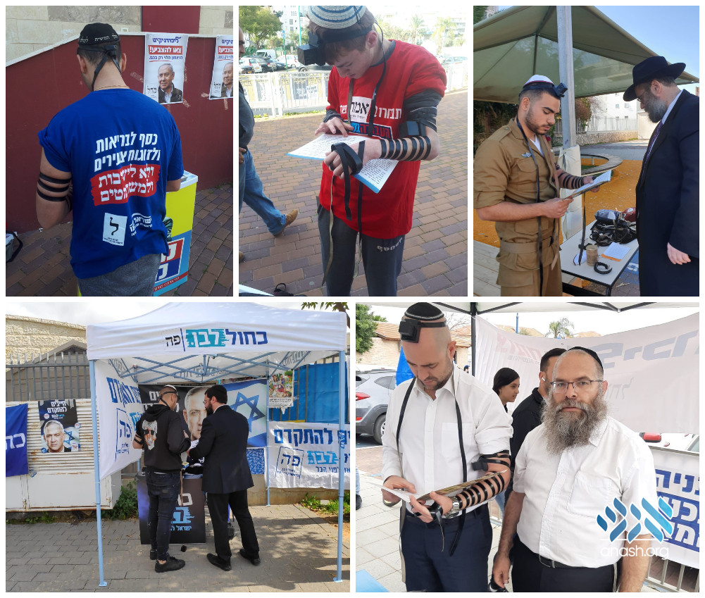 Election day in Israel is a holiday, with most businesses closed to encourage voting. Chabad Chassidim utilized their vacation and the hundreds of thousands of voters congregating by the polls for a mass Mivtza Tefillin.