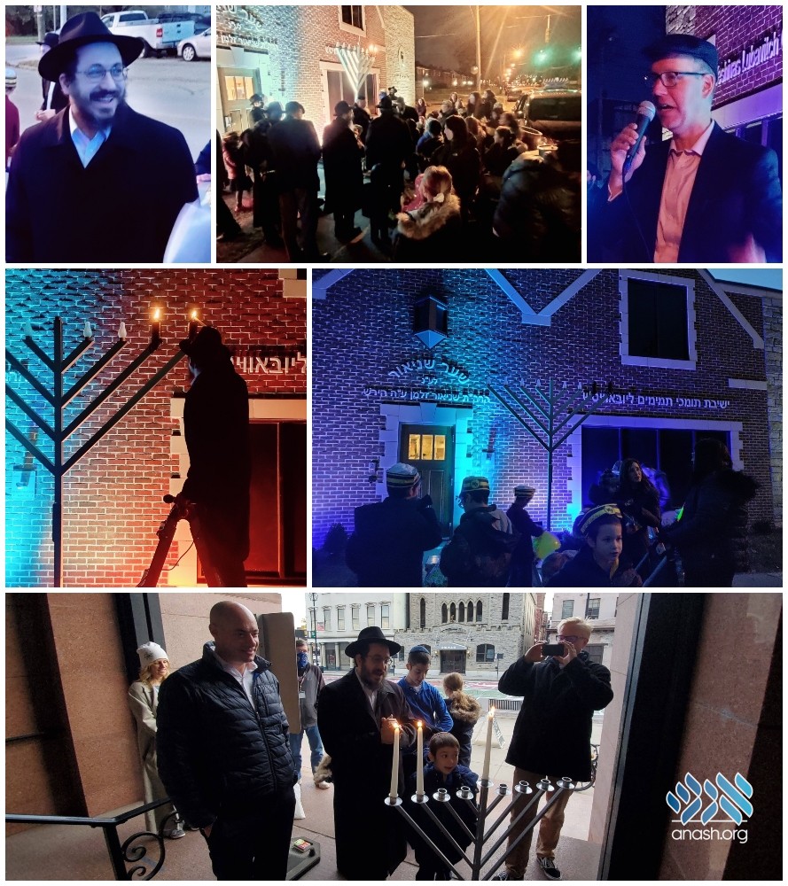 On Monday night, the Chabad community joined together for a special Menorah lighting in front of “770 – Lubavitcher Rebbe Way” – the Chabad Yeshiva which had recently been remodeled to look like 770, on the street that had just been renamed in honor of the Rebbe. The event was joined by State Senator Louis Blessing.
