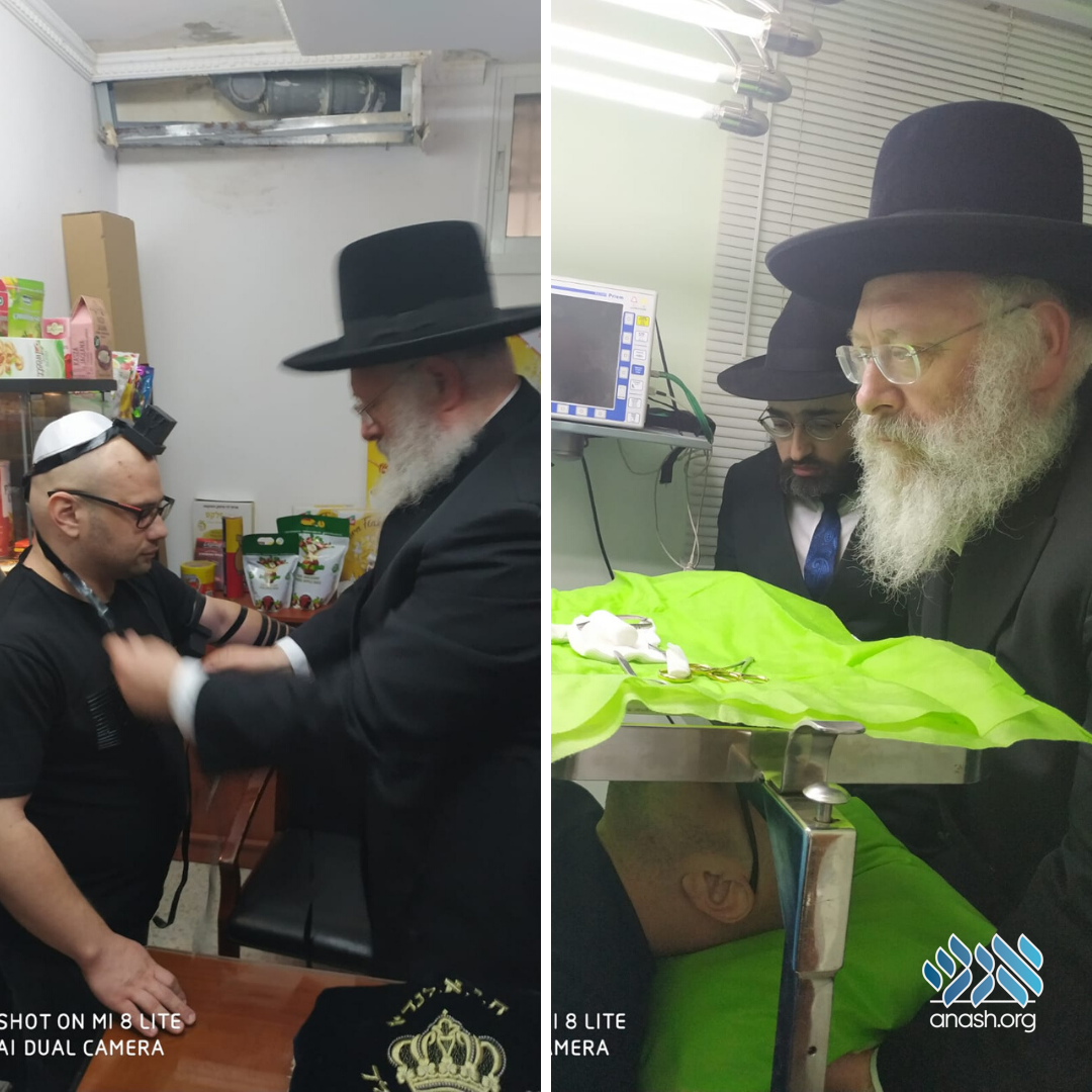Chief Rabbi of Bnei Brak Rabbi Yitzchak Aizik Landa helps a Yid put on Tefilin for the first time, just moments after serving as the Sandek at his bris.
