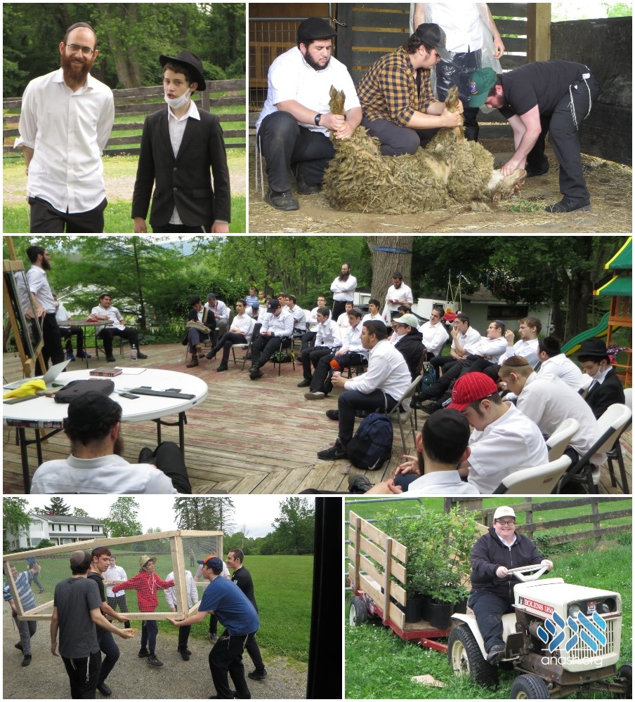 Once the animals were shechted, the boys split up into groups. The majority of the students went with Rabbi Sandhaus to help out with farm chores. One group built tables and benches, while other boys planted blueberry bushes and sunflowers. They drained a muddy patch for planting, removed weeds, and erected a new fence. The bochurim worked with the livestock as well, feeding and milking goats, and feeding the herd of alpacas that Rabbi Sandhaus raises on the farm.