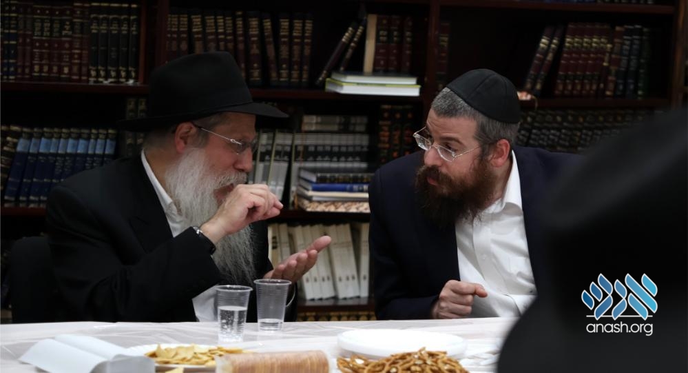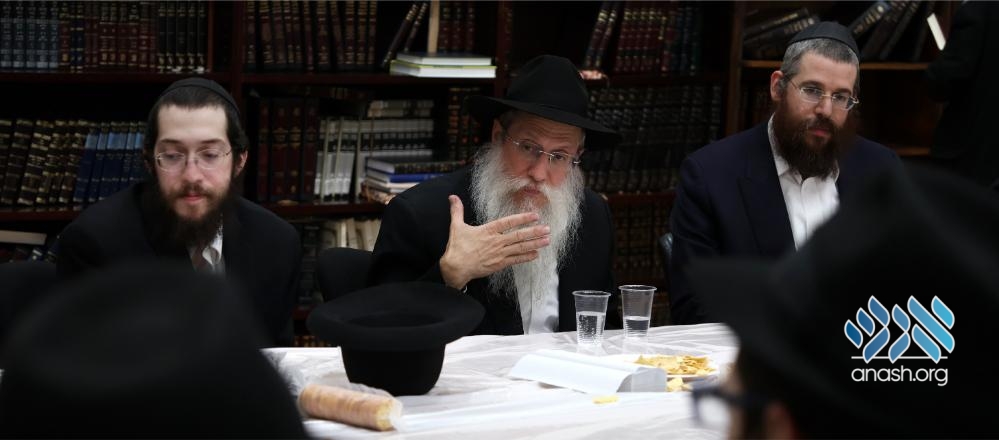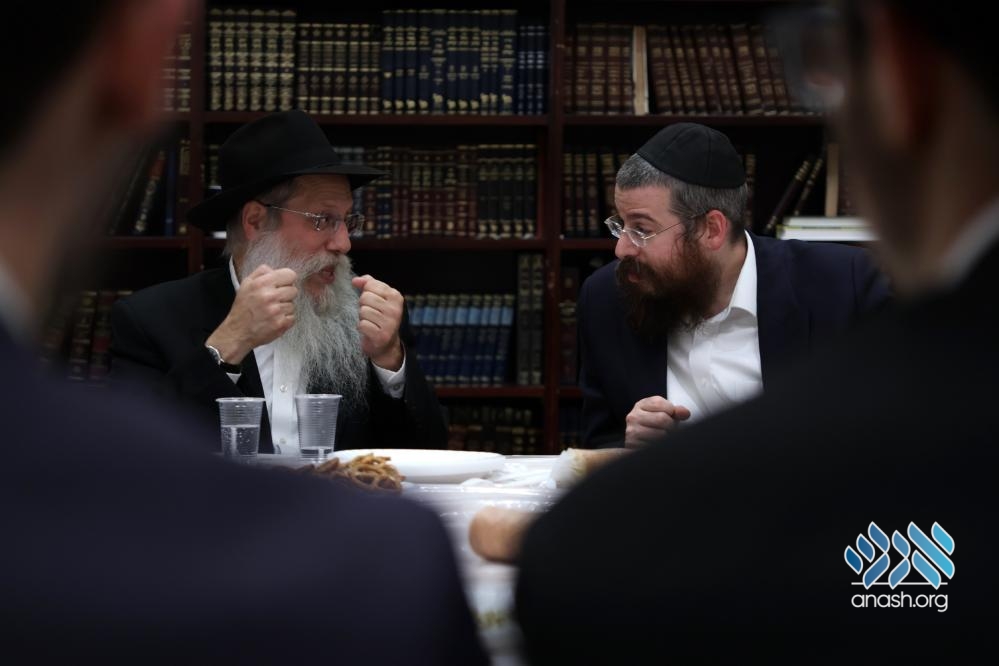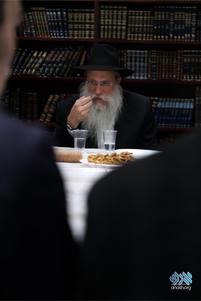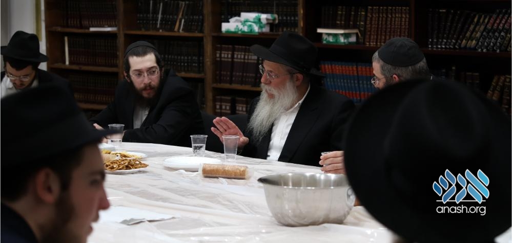 Also participating in the farbrengen were the yeshiva’s mashpia, Rabbi Yosef Klyne, and the guest’s son, Rabbi Binyomin Wilhelm, mashpia in Shiur Alef. The farbrengen concluded with joyous dancing.