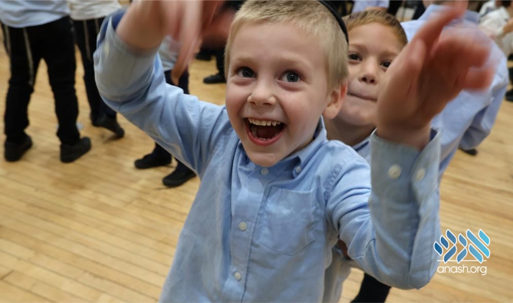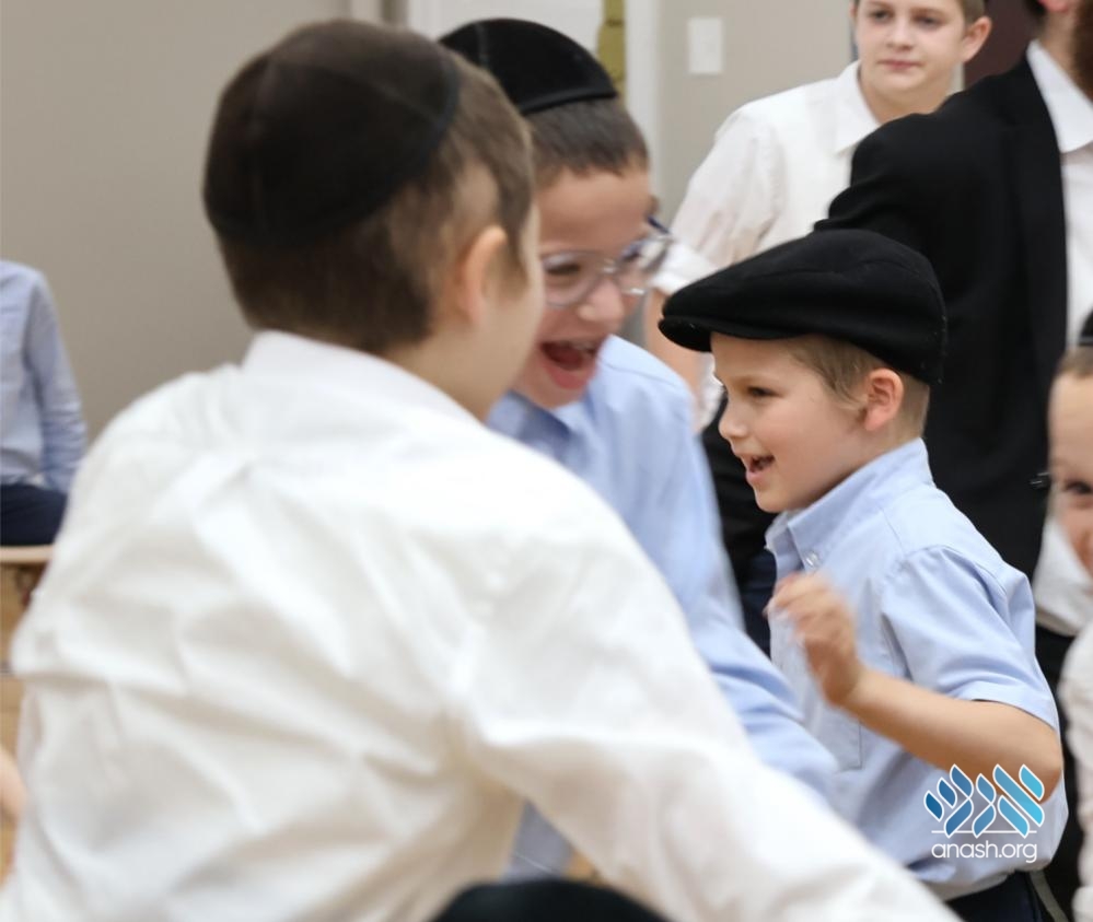 After a short farbrengen where the bochurim spoke to the children about the significance of the day, the yeshiva and cheder talmidim together erupted in prolonged rikudim, filling the yeshiva with simcha and chayus.