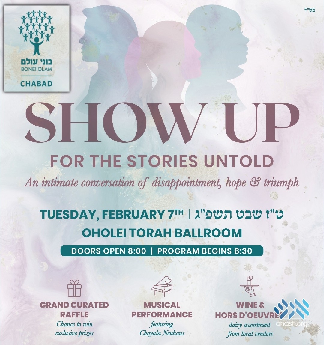 Since our initial Show Up event in 2020, the community has shown up in overflow of numbers, surpassing each previous year. This year, for the third time, we ask once again to come and show support. Show up for the stories untold; an evening of intimate conversation of disappointment, hope and triumph with a musical performance by Chayala Neuhaus.