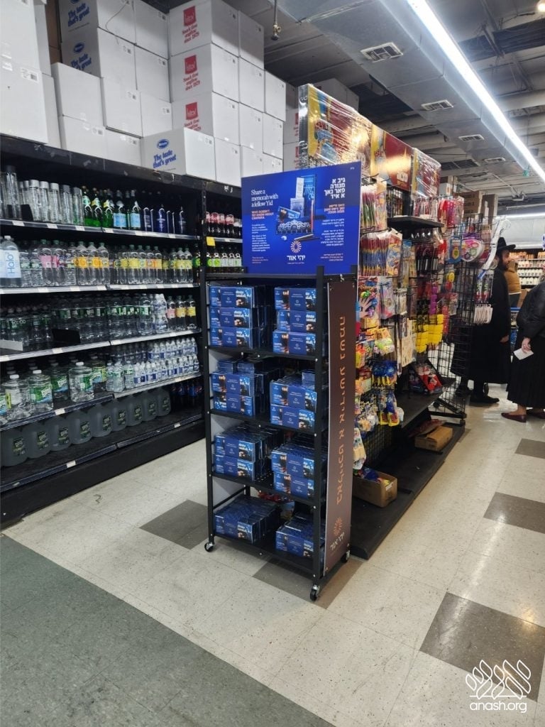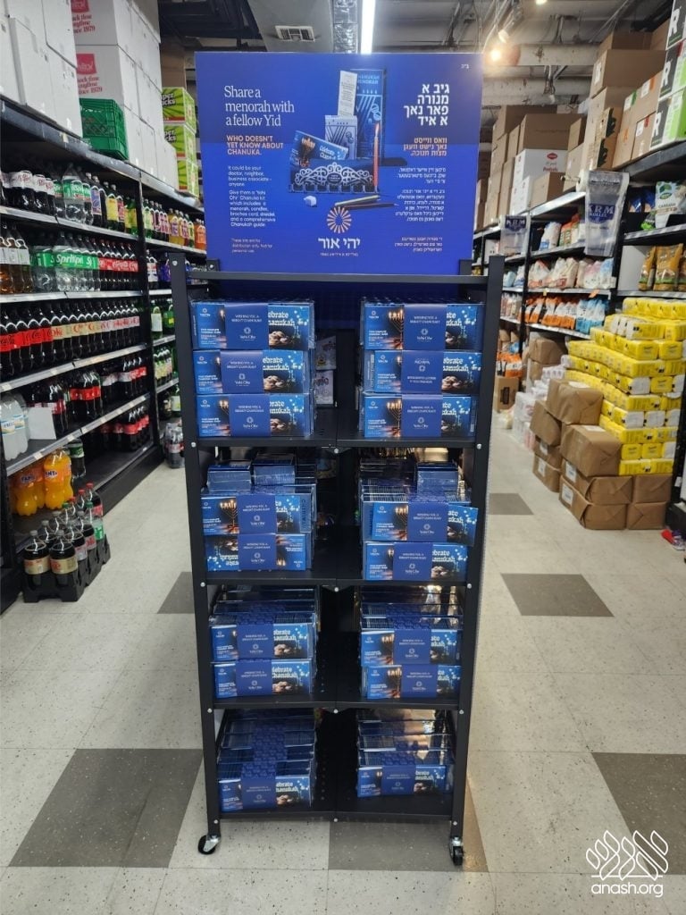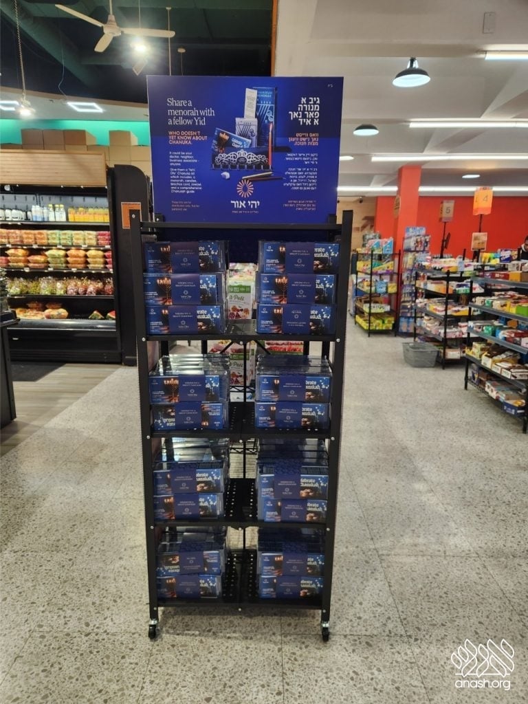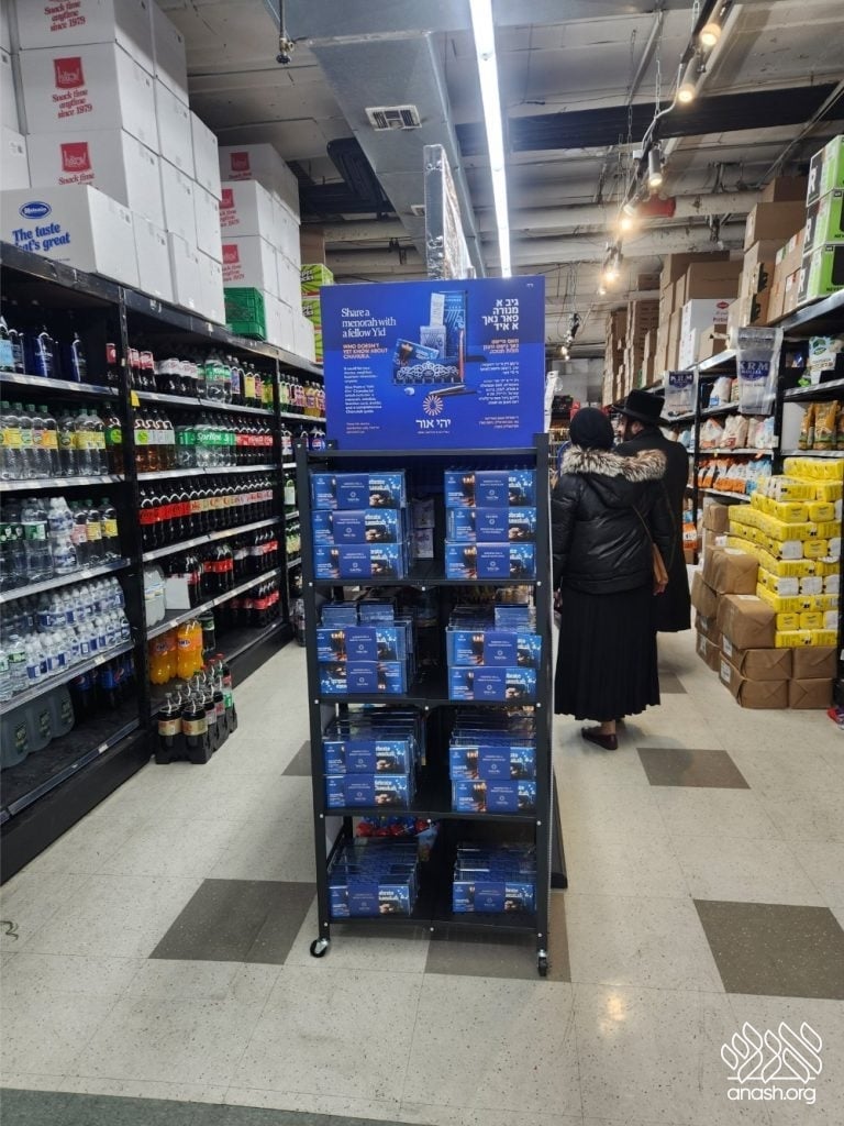 ‘Yehi Ohr’ has arranged elegant displays with Mivtzoim-style menorahs and beautiful Chanukah brochures in all major supermarkets and shuls throughout Boro Park for locals to pick out as many as they need. These displays encourage everyone to “think about those candles that are not yet burning” and gift the Yidden they know a menorah of their own, “so their candles will also burn as long as they can.”