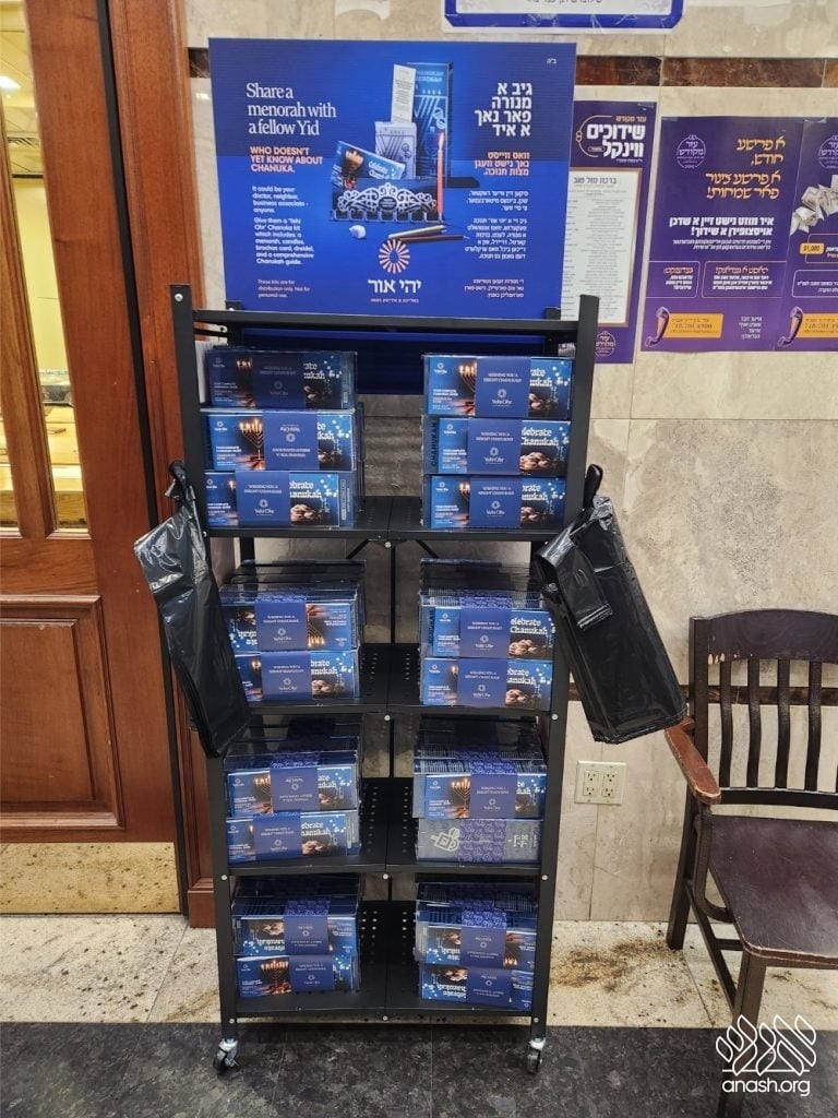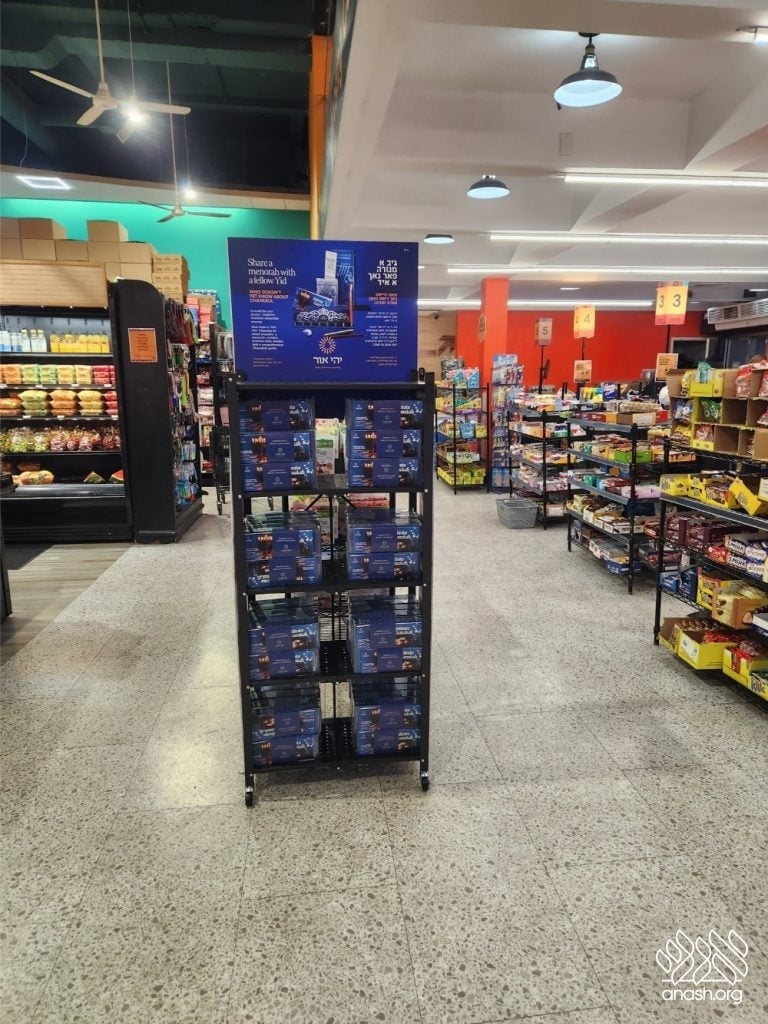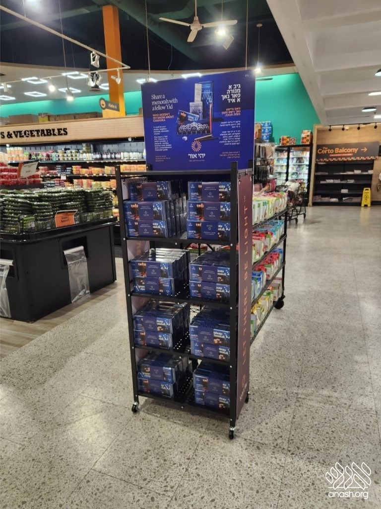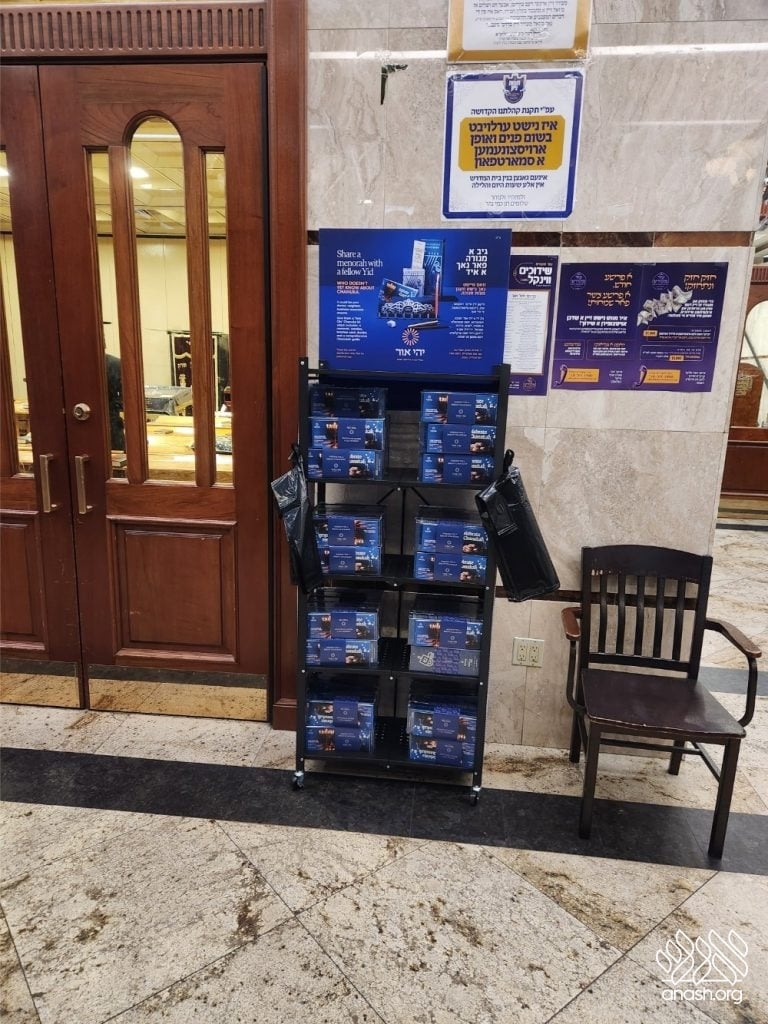 ‘Yehi Ohr’ has arranged elegant displays with Mivtzoim-style menorahs and beautiful Chanukah brochures in all major supermarkets and shuls throughout Boro Park for locals to pick out as many as they need. These displays encourage everyone to “think about those candles that are not yet burning” and gift the Yidden they know a menorah of their own, “so their candles will also burn as long as they can.”
