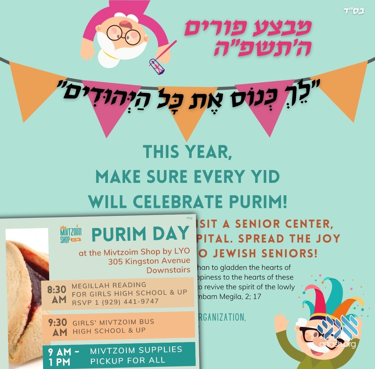 High school, sem and post sem girls, this is for you! Join a 9:30 AM Purim bus to Sheepshead Bay to share the Purim Mitzvos with families. There will be a Megillah reading at 8:30 AM for the girls going on Mivtzoim, to make it easier to join. To RSVP, please message Fruma at (929) 441-9747.