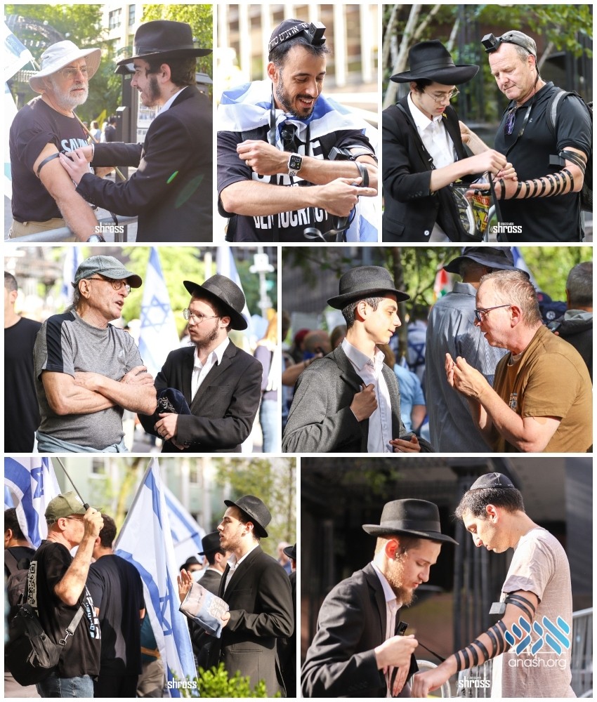 As Israeli Prime Minister Bibi Netanyahu addressed the UN, thousands gathered outside to protest for and against him. Lubavitcher bochurim were on the scene to wrap tefillin.