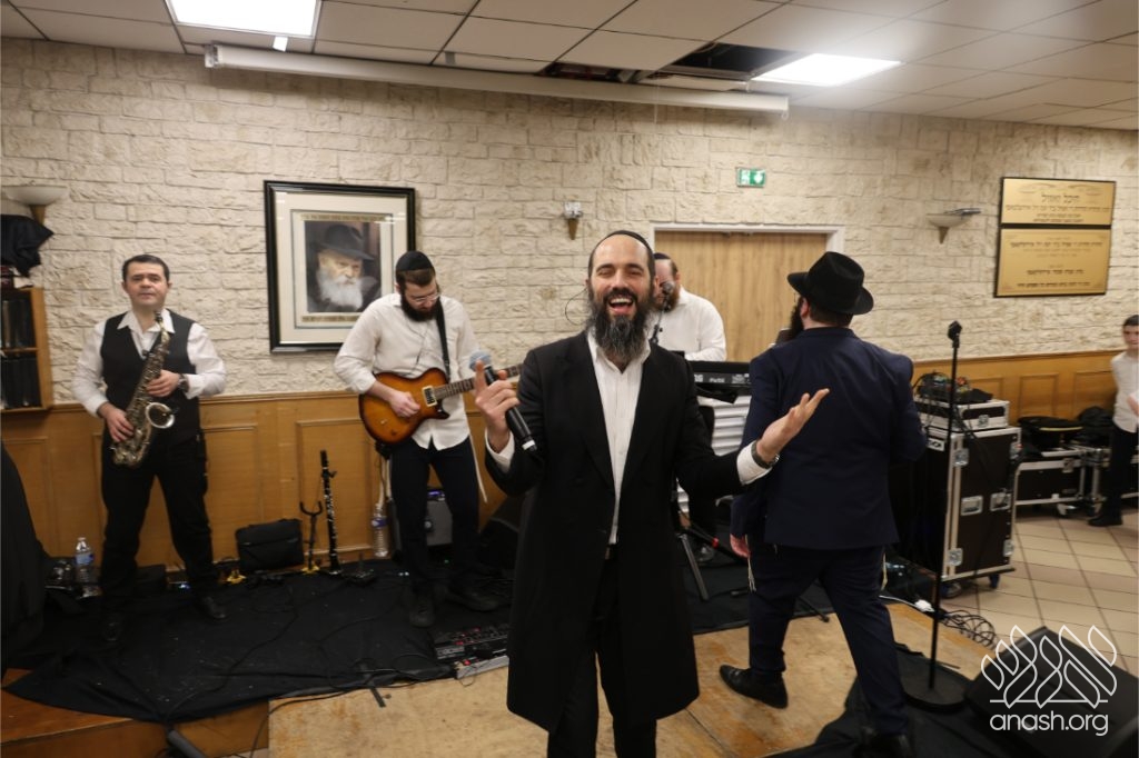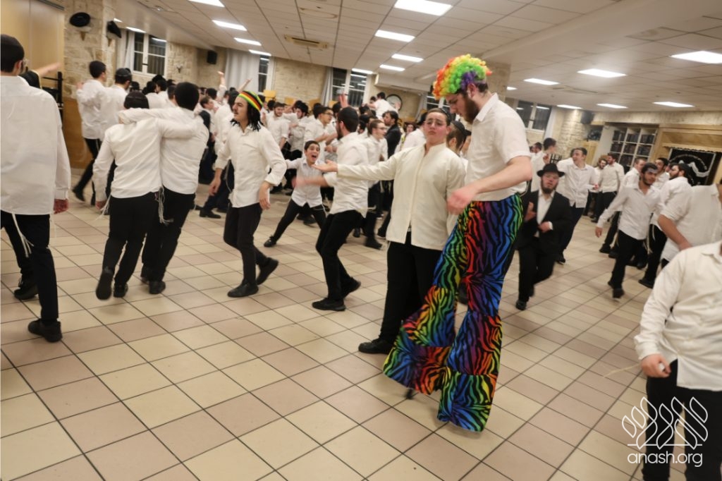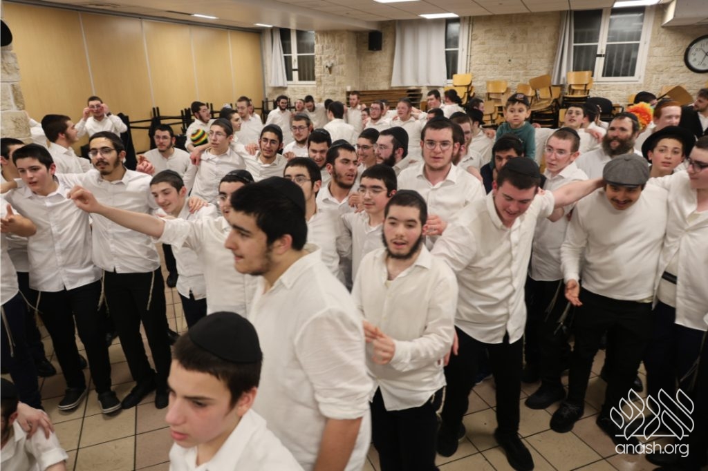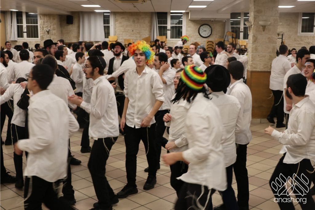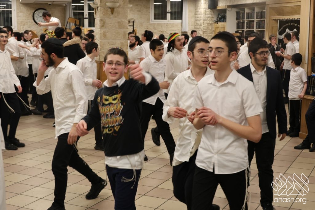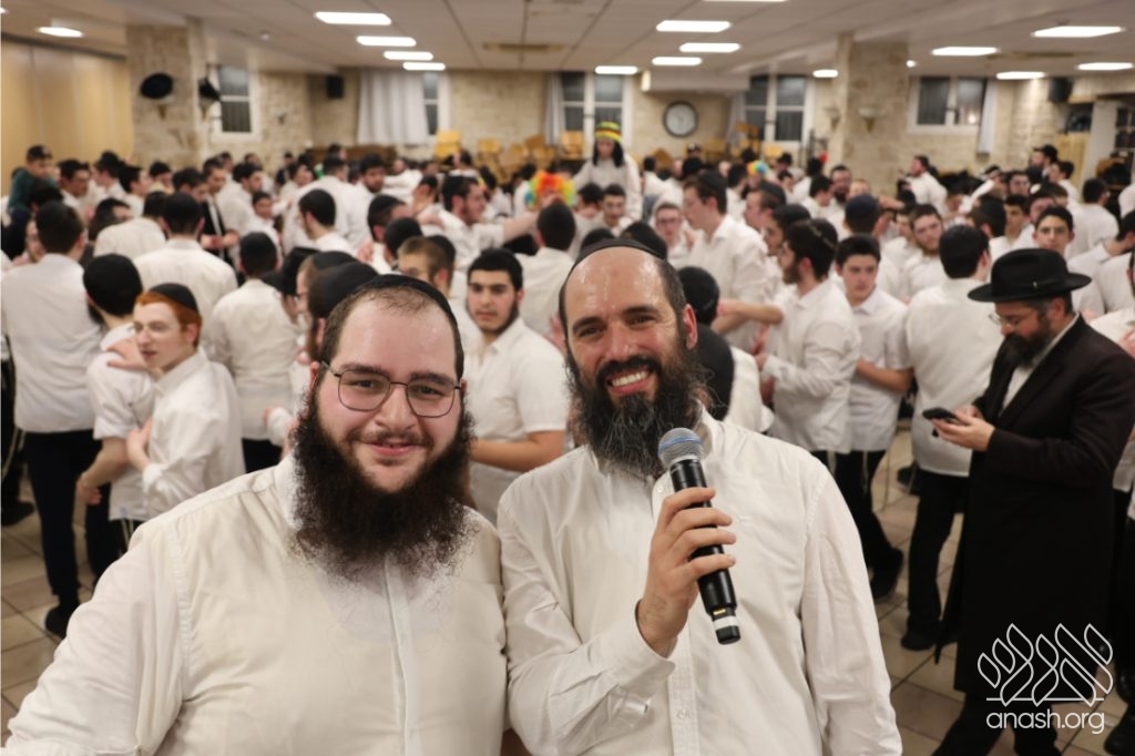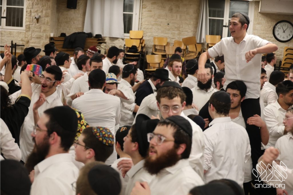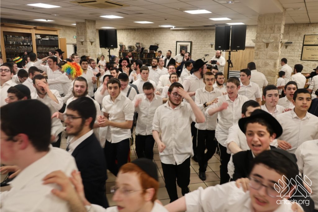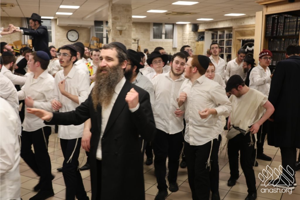 Bochurim at the Brunoy yeshiva burst into joyous dancing, as they were joined by singers Shalom Dijan and Mendy Gabay, accompanied by Asher Tuito and his orchestra, celebrating the simcha for the month of Adar.