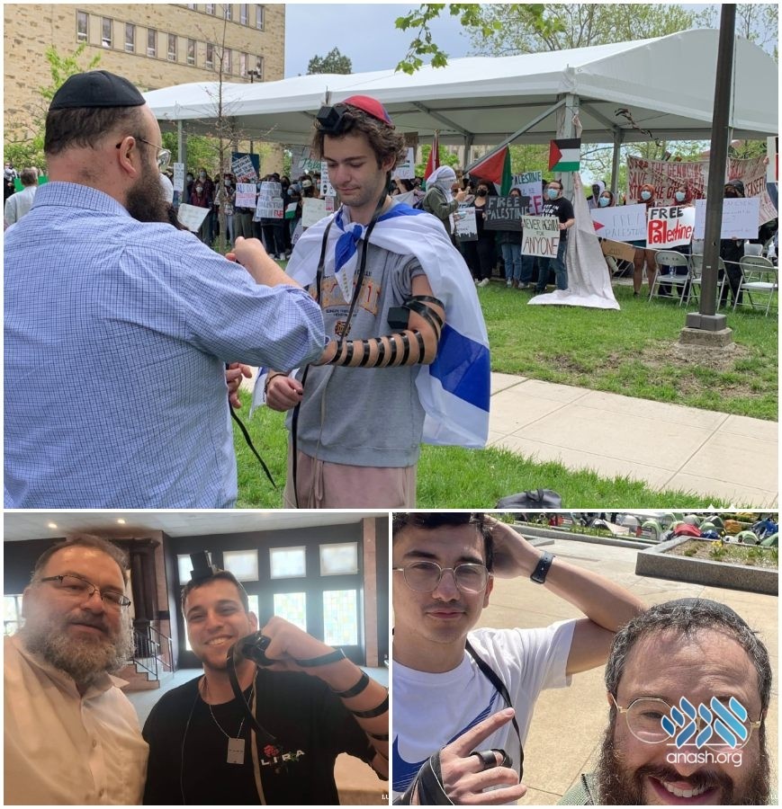 At the University of Kansas in Lawrence, Kansas, after protesters gathered outside Fraser Hall on KU’s campus, Chabad has been providing moral support to Jewish students, setting up a stand at this central campus location and offering the opportunity to do mitzvot. “In Judaism we are taught that we fight darkness with light and we fight hate with more love,” said Rabbi Zalman Tiechtel, who directs KU Chabad with his wife Nechama.