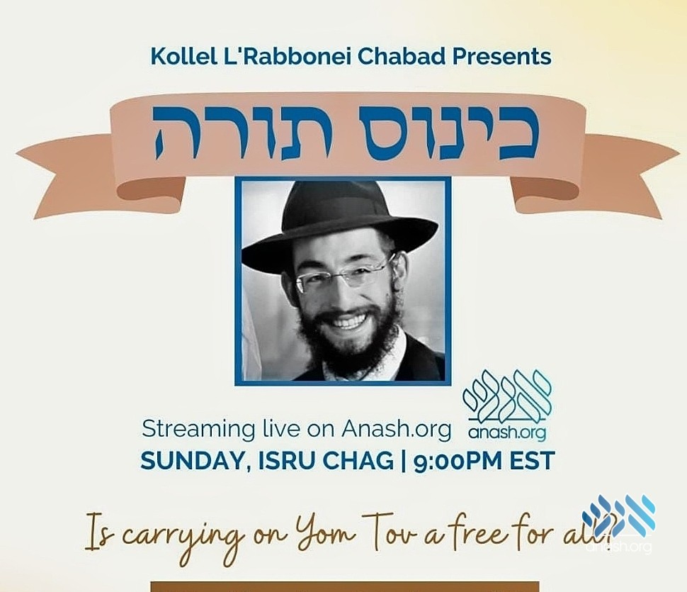 Kollel L’Rabbonei Chabad will be presenting a Kinus Torah on Sunday, Isru Chag Shavuos, addressed by Kollel member Rabbi Menachem Rotenberg, on the topic of carrying on Yomtov.
