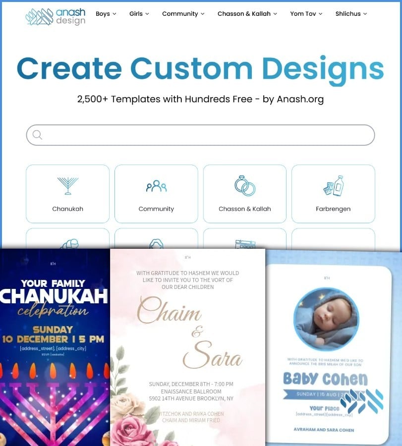 Built by Anash for Anash, the platform boasts over 2,500 fully customizable templates, catering to a wide range of needs and occasions. From joyous lifecycle events like l’chaim, bris, upshernish, bar mitzvah, and bas mitzvah to community milestones such as farbrengens, siyumim, and hachnosas sefer Torahs, the platform offers professional-quality designs at your fingertips. In addition, templates are available for shlichus initiatives, Yom Tov events, and fundraising campaigns, ensuring that every aspect of Jewish life is represented.