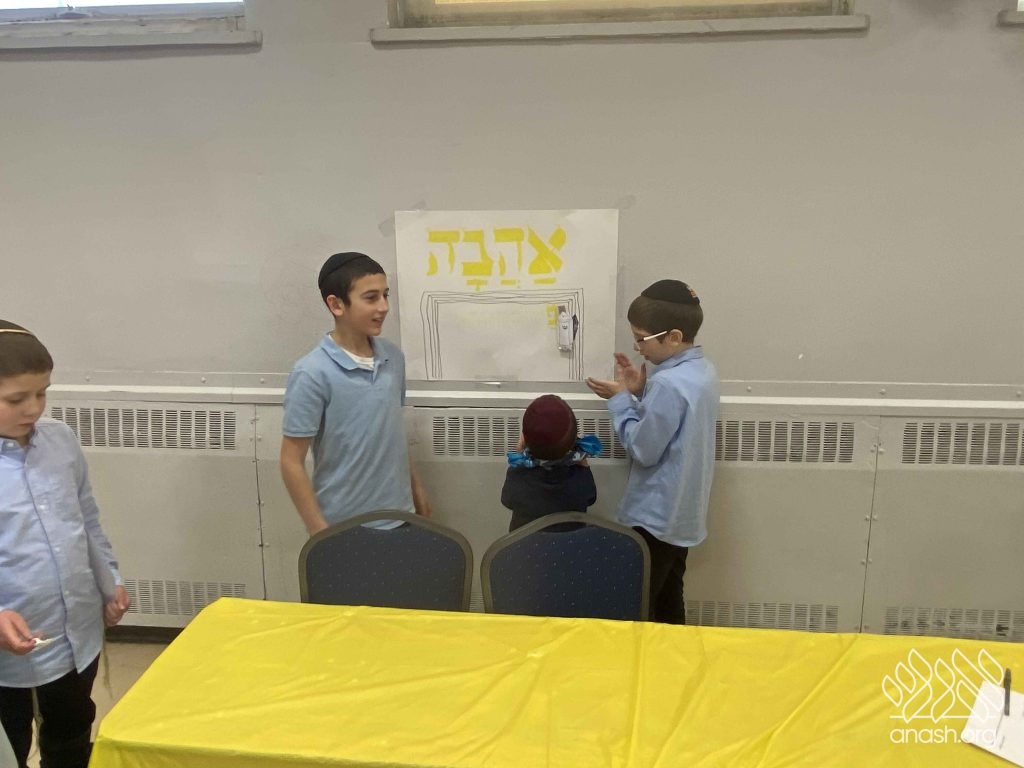• Sefer Ahavah: Students participated in a “Pin the Mezuza” challenge, attempting to affix a Mezuza to the correct spot on a doorpost while blindfolded.