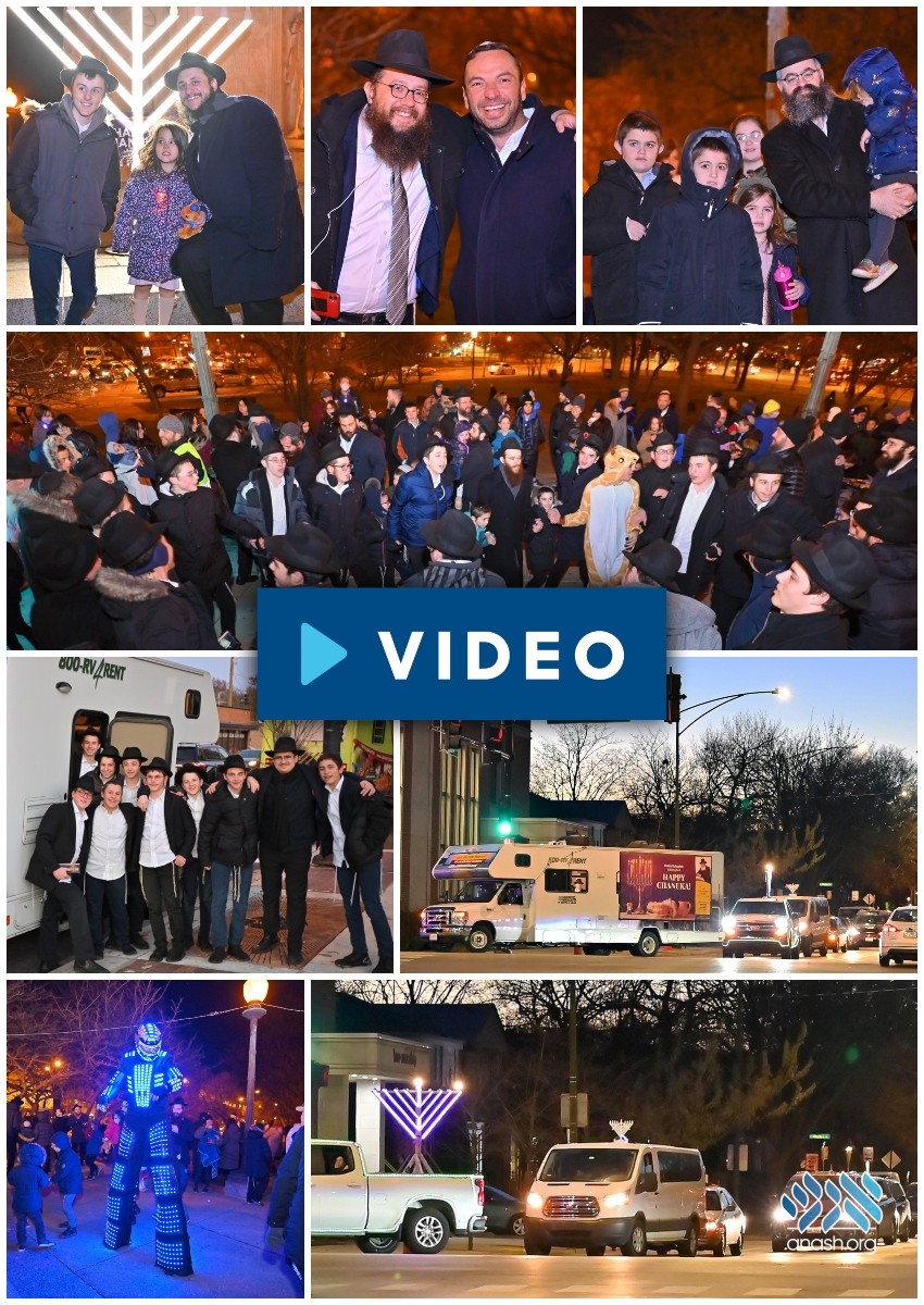 The parade culminated at Logan Square, under the auspices of Rabbi Yosef Moscowitz. There the music played, the donuts, hot latkes and LED necklaces were distributed, and Yarden Landauer – who had driven a truckload of Menorah kits and giant public menorahs from New York to Chicago to make sure they would be there to give to Jews hopeful to perform the mitzvahs was honored with lighting the 12-foot Menorah.