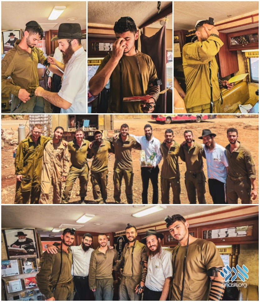 Photographer Dovber Hechtman documented the operations Mitzva Tanks in full operation near the Lebanese border. Rabbi Yehuda Pevzner, a Crown Heights tankist, and Rabbi Elram Ben Harush, a Tzfas tankist, were both pictured there helping soldiers lay tefillin while danger surrounded them from all sides.