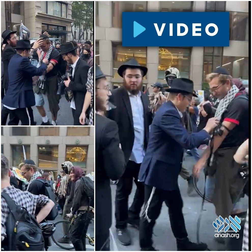 In an unusual encounter, Chabad Bochurim find a Jewish man at a ‘pro-Palestine’ march on October 7th in New York and wraps him in Tefillin whilst walking backwards in sync with the flow of the march.