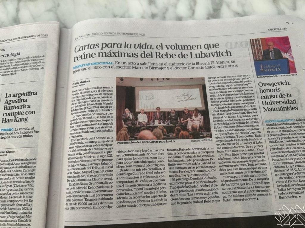 This momentum follows the book launch on 4 Kislev 5786 (November 24 2025) at the historic El Ateneo auditorium. La Nación, one of Argentina’s leading newspapers, described Cartas para la Vida as “a work that offers tools for getting through difficult moments and for finding spiritual well-being,” noting that “prominent voices from literature, science, psychology, and spiritual leadership gathered for the presentation,” and that it “is based on the abundant correspondence the Rebbe maintained throughout his life with people who went through moments of anguish, loss, and confusion.”