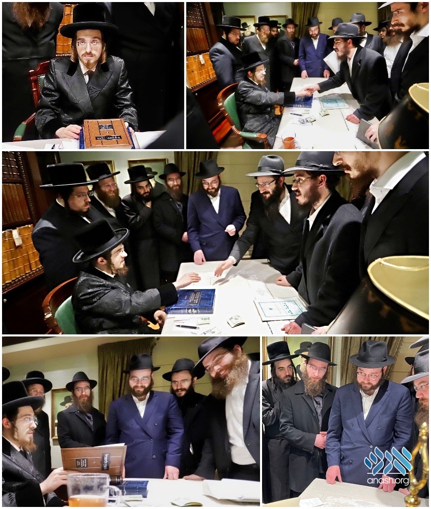 R’ Shmuli Klyne then presented the Sadigura Rebbe with a sefer of the Rebbe’s explanations on Maseches Tomid, which he had compiled together with Menachem Heller.