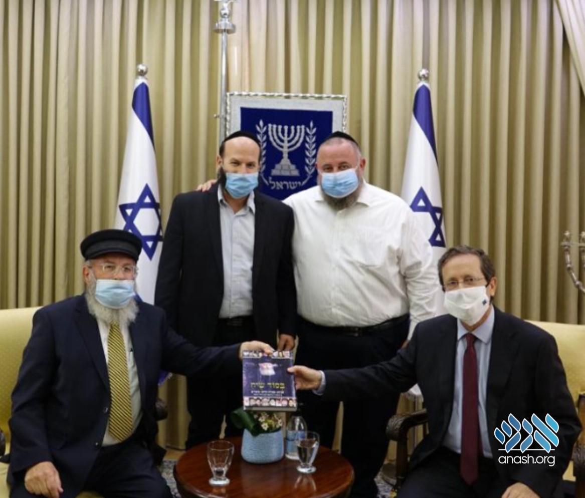 On Tuesday, a delegation of Chabad chassidim visited the new Israeli President, Yitzchak Herzog, presenting him with a gift: a book which contains the Rebbe’s correspondence with the President’s grandfather.