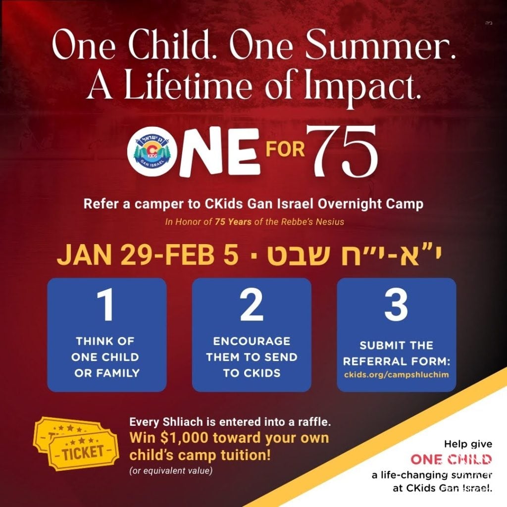 Building on that momentum, CKids announced a one-week referral initiative, titled “One for 75,” marking 75 years of the Rebbe’s Nesius. The campaign runs from Thursday, January 29 (Yud Aleph Shevat), through Thursday, February 5.