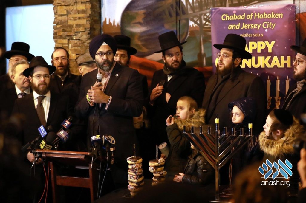 Behind the table, a small banner was hung, wishing a Happy Chanuka from Chabad of Hoboken and Jersey City. Shliach Rabbi Moshe Schapiro who had helped arranged the event told reporters that the event symbolized light overcoming darkness. “Good will always win in the long run,” he said.