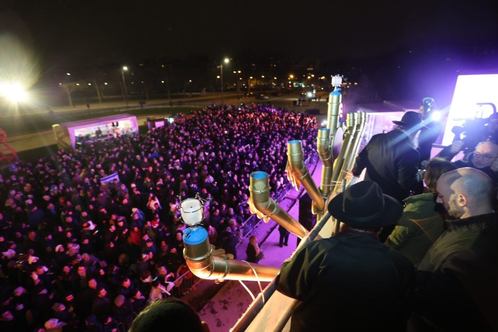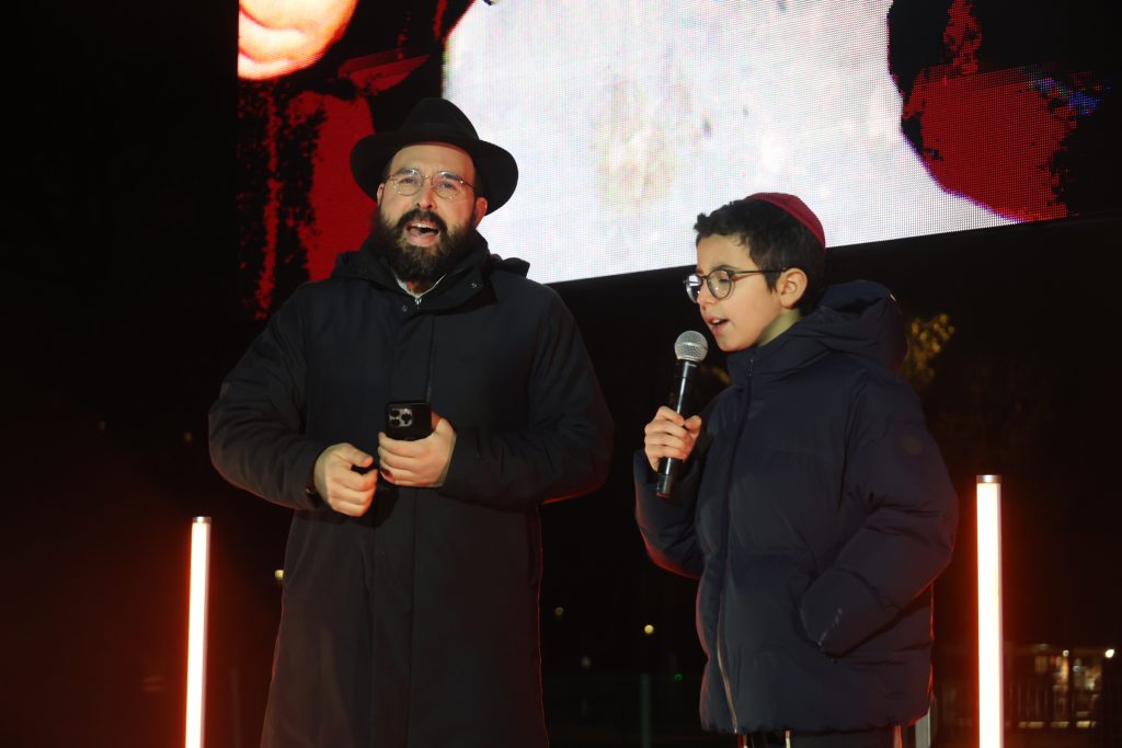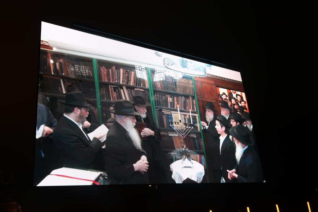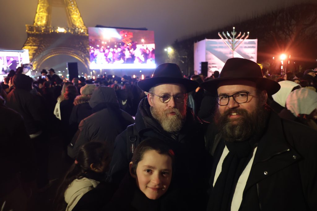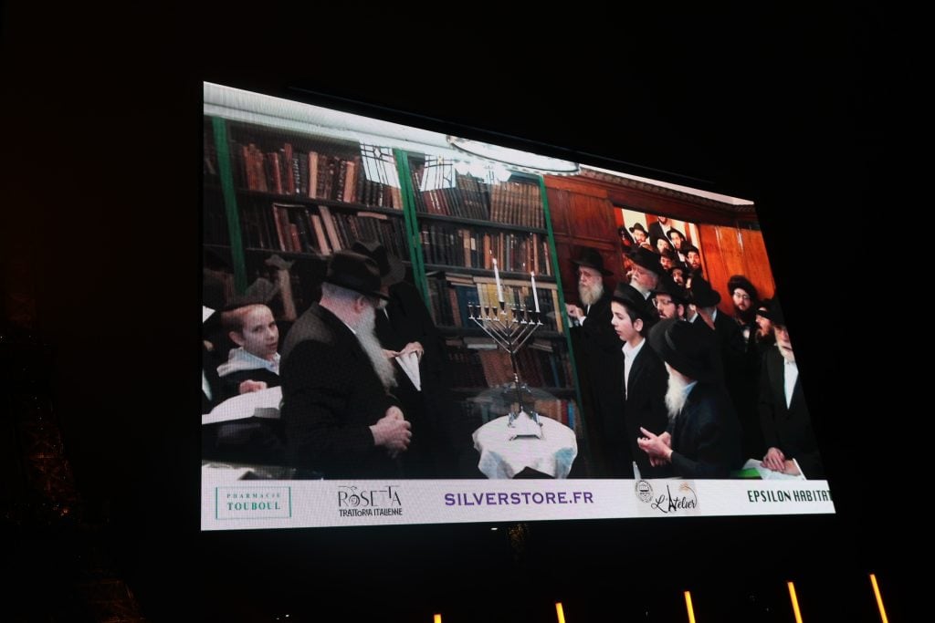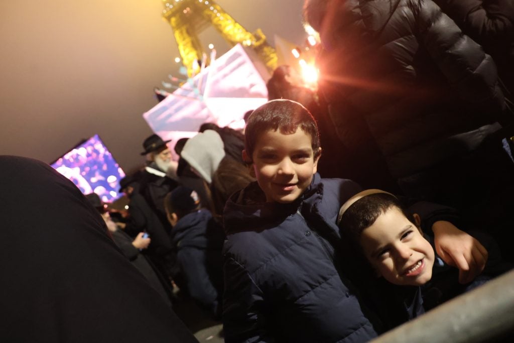 The lighting was broadcast live on the internet, reaching hundreds of thousands of Jews worldwide. Simultaneously, menorahs were lit at the Rebbe’s room at 770 Eastern Parkway in Brooklyn, and a large menorah was lit at the Eiffel Tower in Paris, under the leadership of shliach Rabbi Mendel Azimov.
