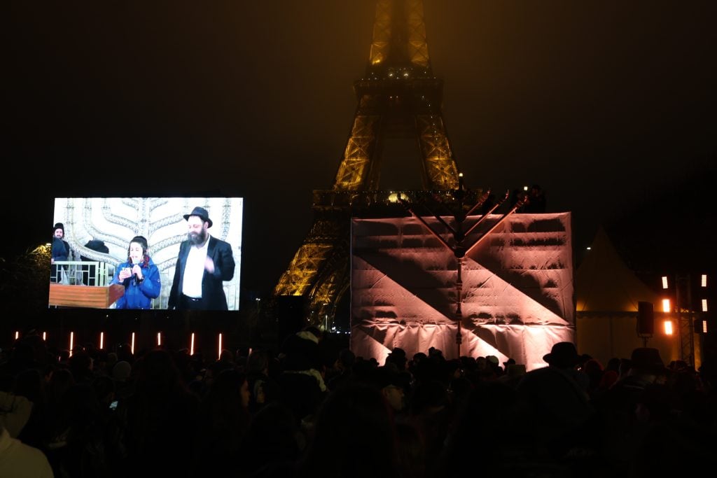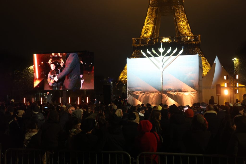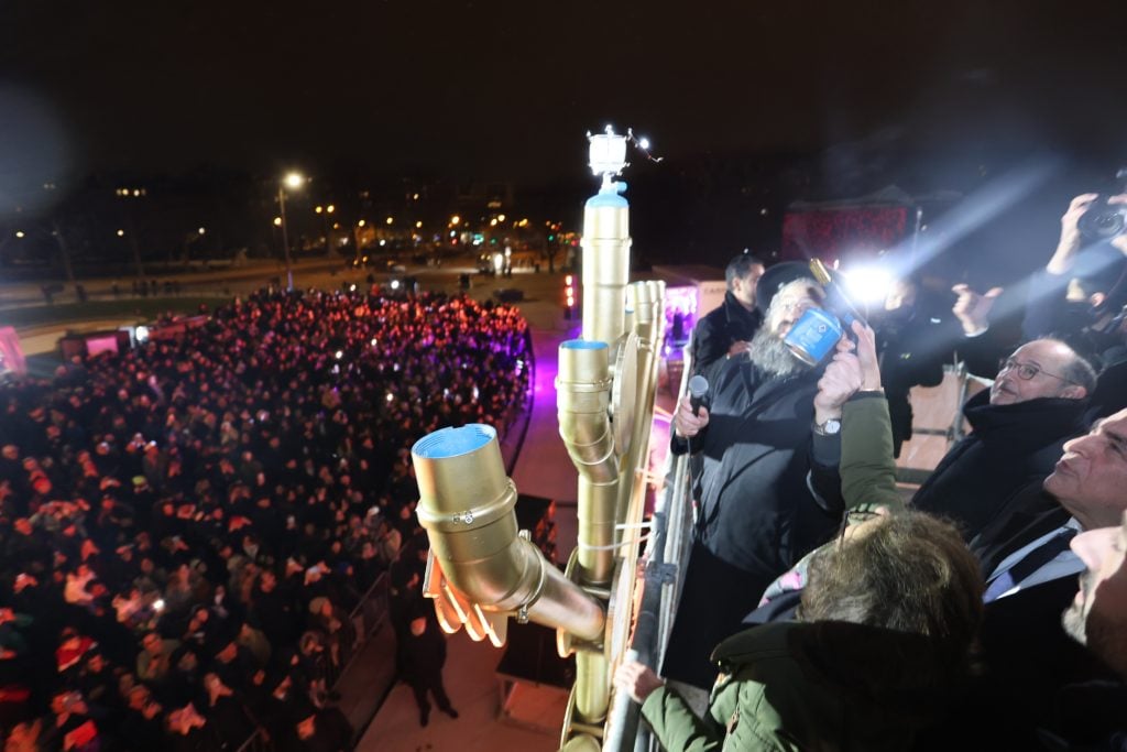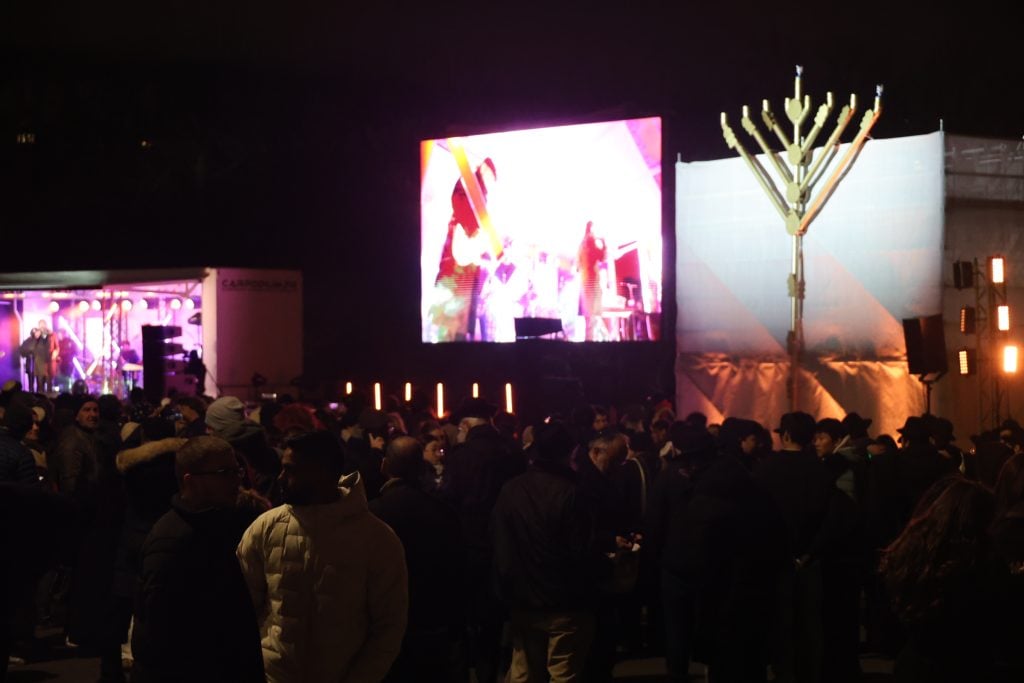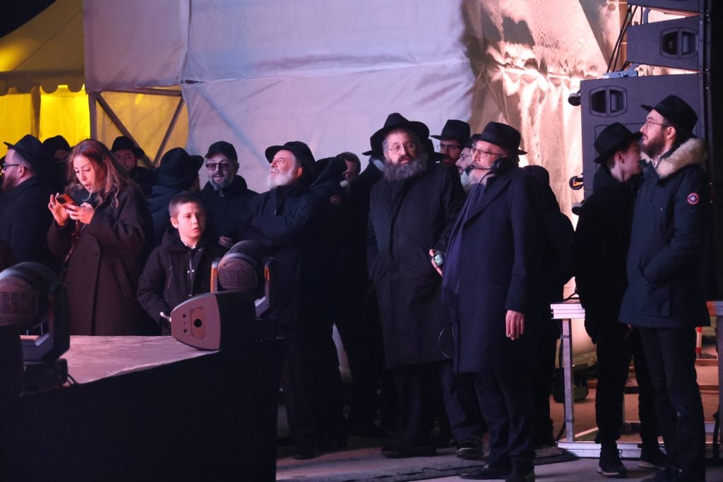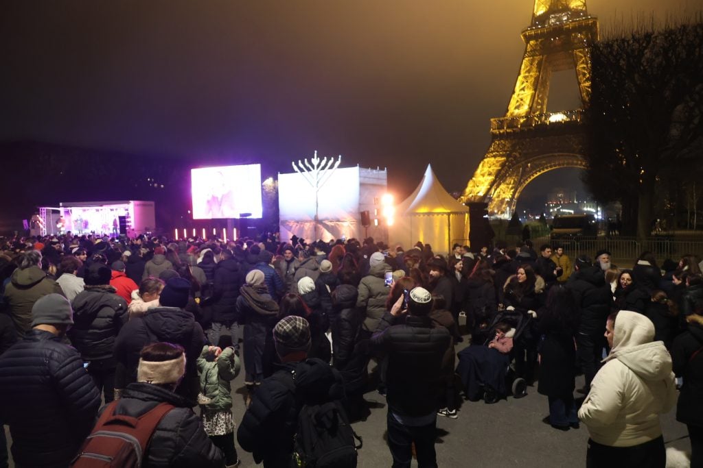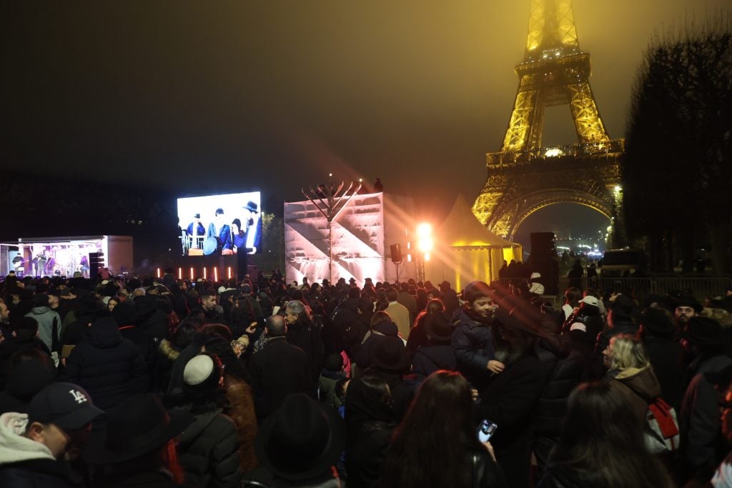The lighting was broadcast live on the internet, reaching hundreds of thousands of Jews worldwide. Simultaneously, menorahs were lit at the Rebbe’s room at 770 Eastern Parkway in Brooklyn, and a large menorah was lit at the Eiffel Tower in Paris, under the leadership of shliach Rabbi Mendel Azimov.