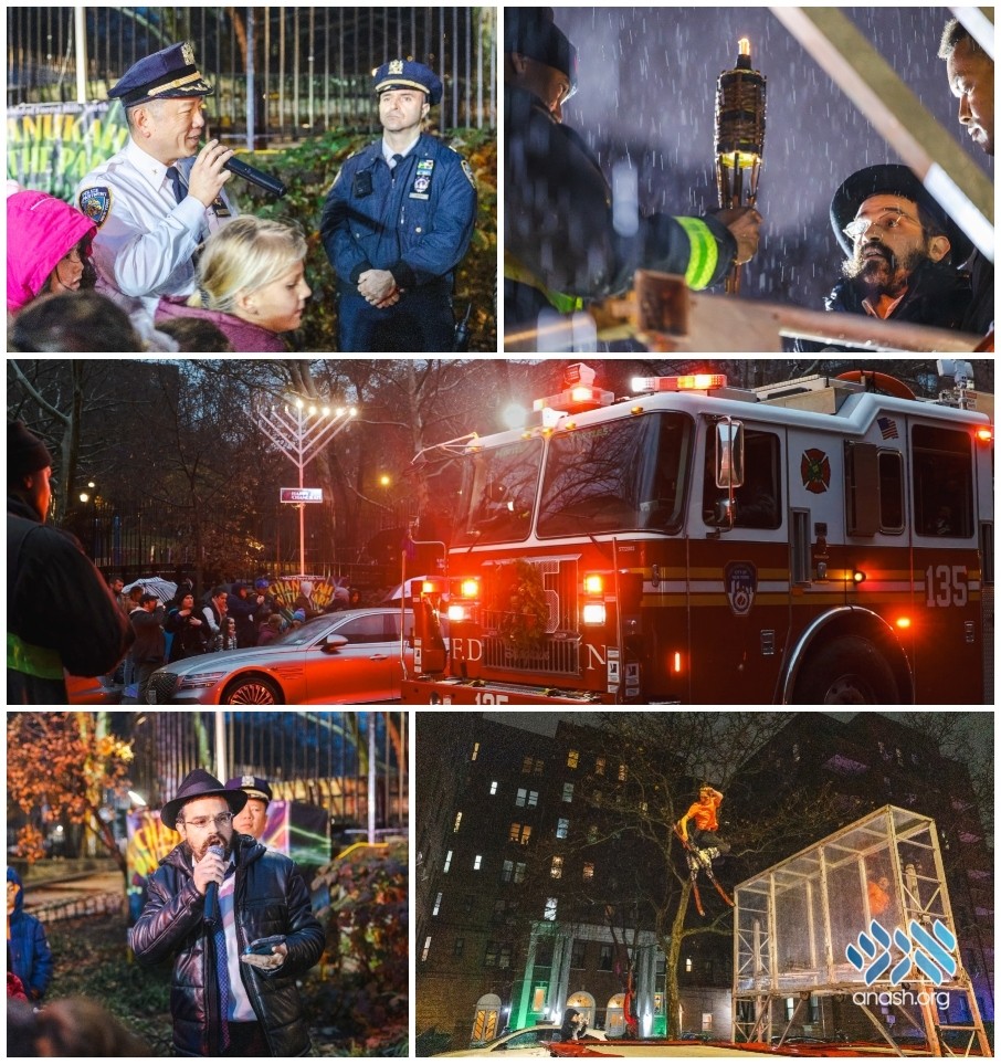 The ambiance feels traditional yet innovative. “Every year, we must light the 18-foot menorah, which is of #1 importance to spread the miracle of light, and we pursue it with our FDNY amazing team that comes to help light with a positive fire,” said Rabbi Mendy. A firefighter joins the rabbi to accomplish a noble endeavor from a cherry picker. The menorah is kindled with a torch, beginning with the Shamash.