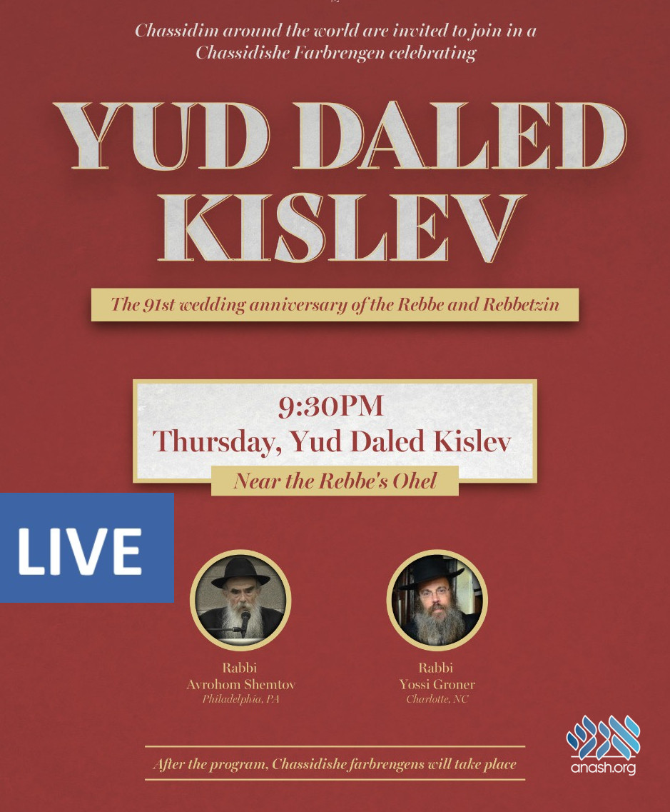The Farbrengen will be addressed by Rabbi Avrohom Shemtov and Rabbi Yossi Groner. The Farbrengen will be broadcast here at Anash.org.