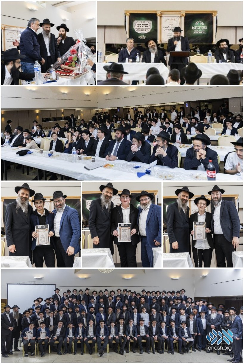 Bochurim of Tomchei Temimim Antwerp, together with many of their parents, gathered for an end-of-year event to mark their learning achievements with a festive seudas mitzvah and award ceremony, concluding a strong year of serious learning and commitment.