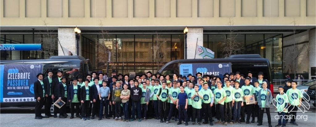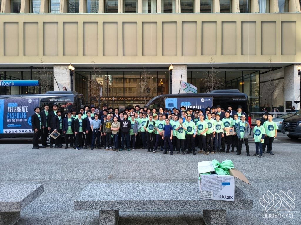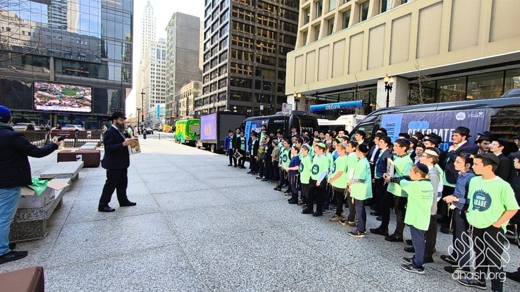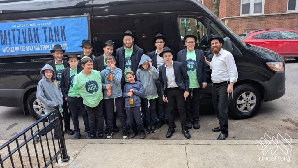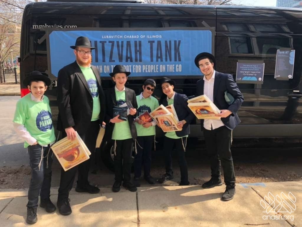 Local bochurim, together with students of Cheder Lubavitch, filled eight Mitzvah Tanks that traveled throughout Chicago, spreading the message of Pesach and distributing Shmurah Matzah and Neshek to passersby during the annual Yud Aleph Nissan parade.