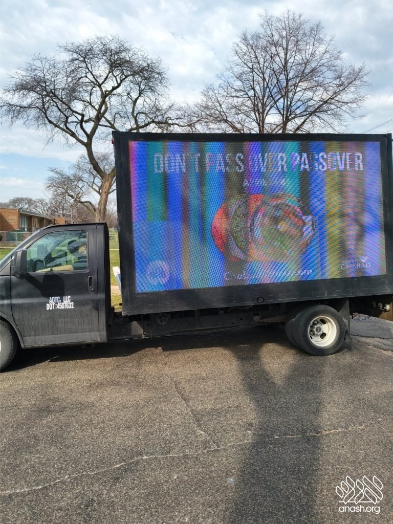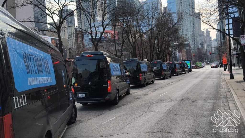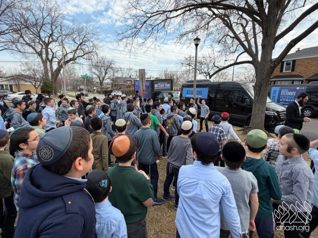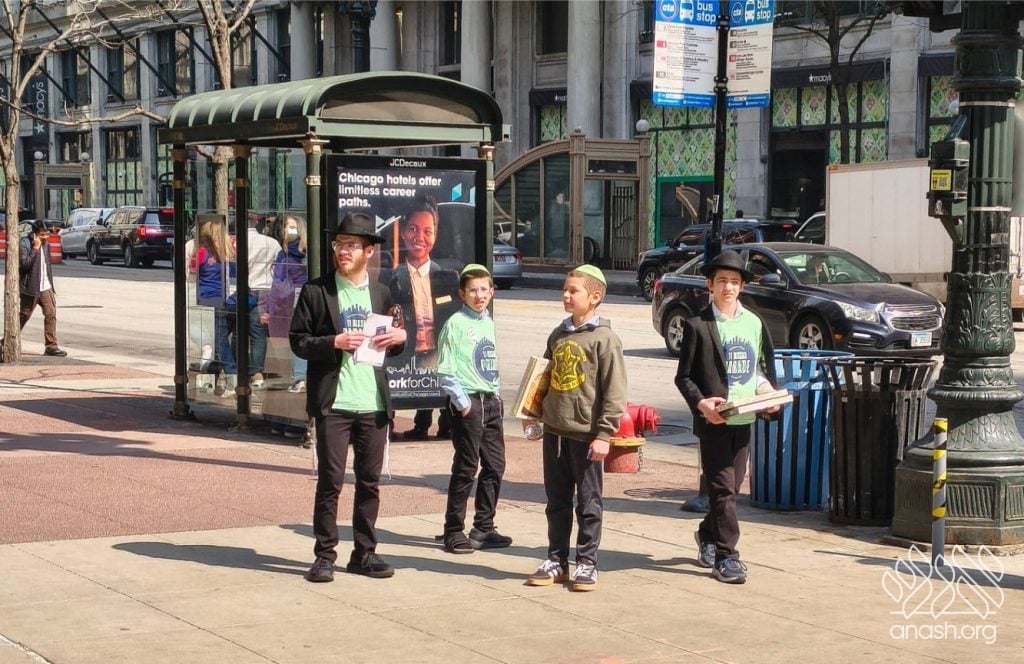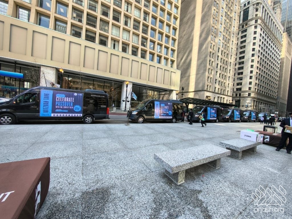 Local bochurim, together with students of Cheder Lubavitch, filled eight Mitzvah Tanks that traveled throughout Chicago, spreading the message of Pesach and distributing Shmurah Matzah and Neshek to passersby during the annual Yud Aleph Nissan parade.