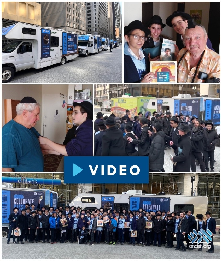 Eight Mitzvah Tanks filled with Shmura Matza and tefillin, drove through downtown Chicago and many suburbs offering Jews on the run a mitzvah on the spot.