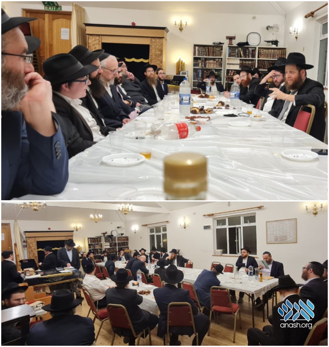 Rabbi Boruch Hertz, rov of the Chabad community in Chicago, farbrenged with Anash in the Golders Green community of London, alongside Rabbi Gedalya Lieberman, rov of the Heichal Menachem shul.