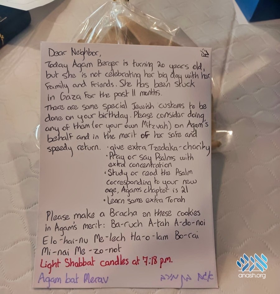 Back in the summer, Agam’s mother, Merav Berger, had put out a request: she was asking people from all over to dedicate mitzvos in honor of her daughter’s 20th birthday while she was still in captivity. Leah took the initiative to hear and decided to share it with as many people as possible.