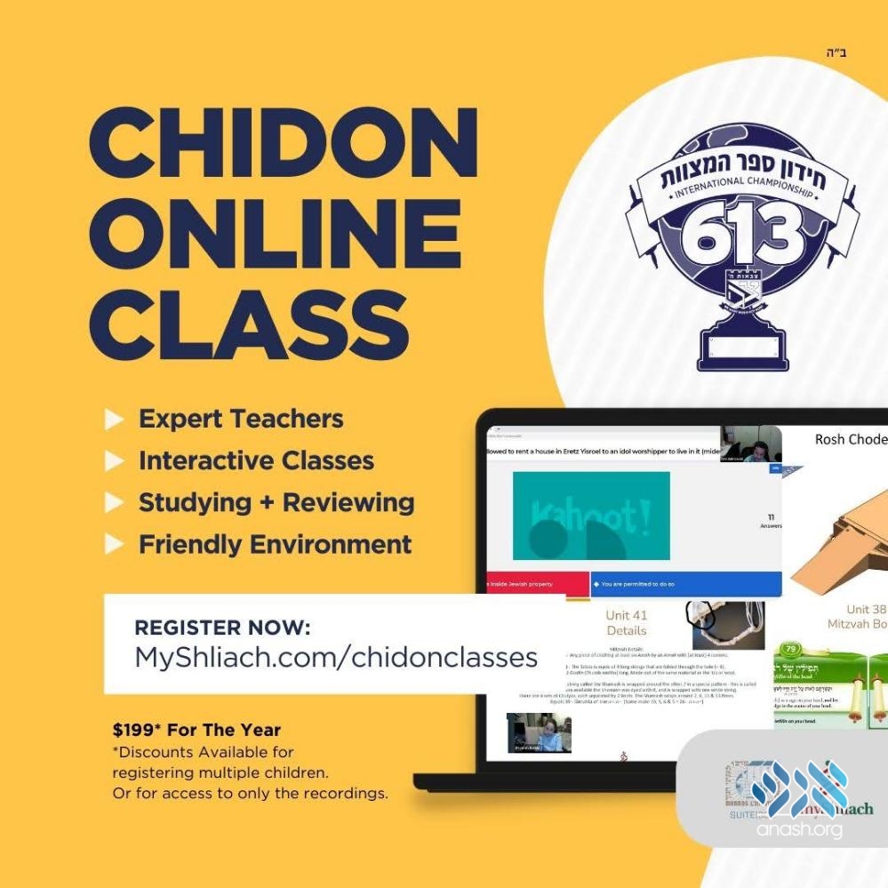 Enrollment is now open. A twenty percent discount is available for MyShliach members. Families can register and see details at MyShliach.com/chidonclasses.