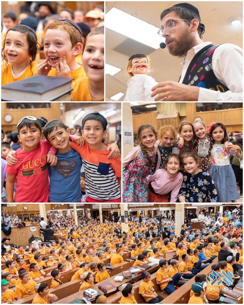 A rally was held in 770 marking the 15th of Av and the 30th yahrzeit of Rabbi JJ Hecht a”h. Children participated in saying the 12 pesukim and davening, and enjoyed a ventriloquist show.