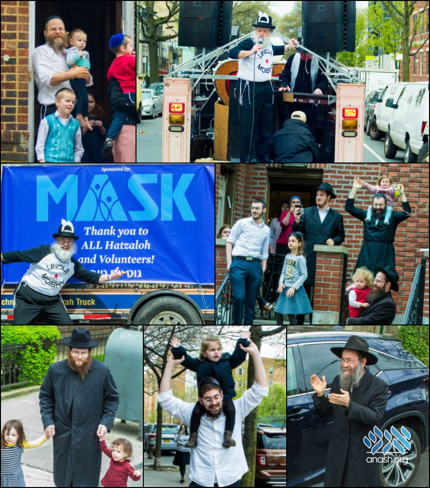 A truck carrying Uncle Moishy drove around the streets of Crown Heights on Tuesday, bringing his infectious spirit and simcha to children across the community. The truck was organized by MASK and the Unity Sefer Torah, in appreciation to all Hatzalah members.