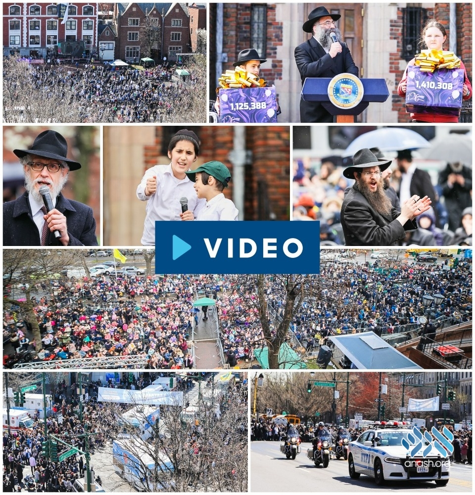 Children and teachers braved the rain on Tuesday morning to come to 770 for a Yud Alef Nissan rally, where they presented a monumental gift to the Rebbe: 2.2 million lines of Torah ba’al peh. The rally concluded with a send off for the 120 Tank Parade.